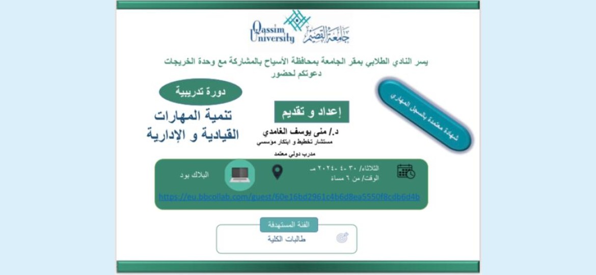 دعا النادي الطلابي بمقر جامعة القصيم بمحافظة الأسياح بالمشاركة مع وحدة الخريجات لحضور دورة تدريبية تحت عنوان "المهارات القيادية والإدارية"، من إعداد وتقديم الدكتورة منى يوسف الغامدي، مستشار تخطيط وابتكار مؤسسي، مدرب دولي معتمد، ومن المقرر أن تعقد الدورة في تمام الساعة السادسة من مساء اليوم الثلاثاء الموافق 30 أبريل الجاري عبر تقنية البلاك بورد.