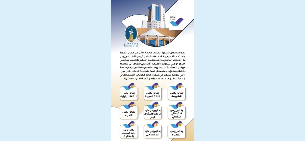 حصلت جامعة حائل على اعتماد 9 برامج أكاديمية من هيئة تقويم التعليم والتدريب، ممثلةً بالمركز الوطني للتقويم والاعتماد الأكاديمي "اعتماد".