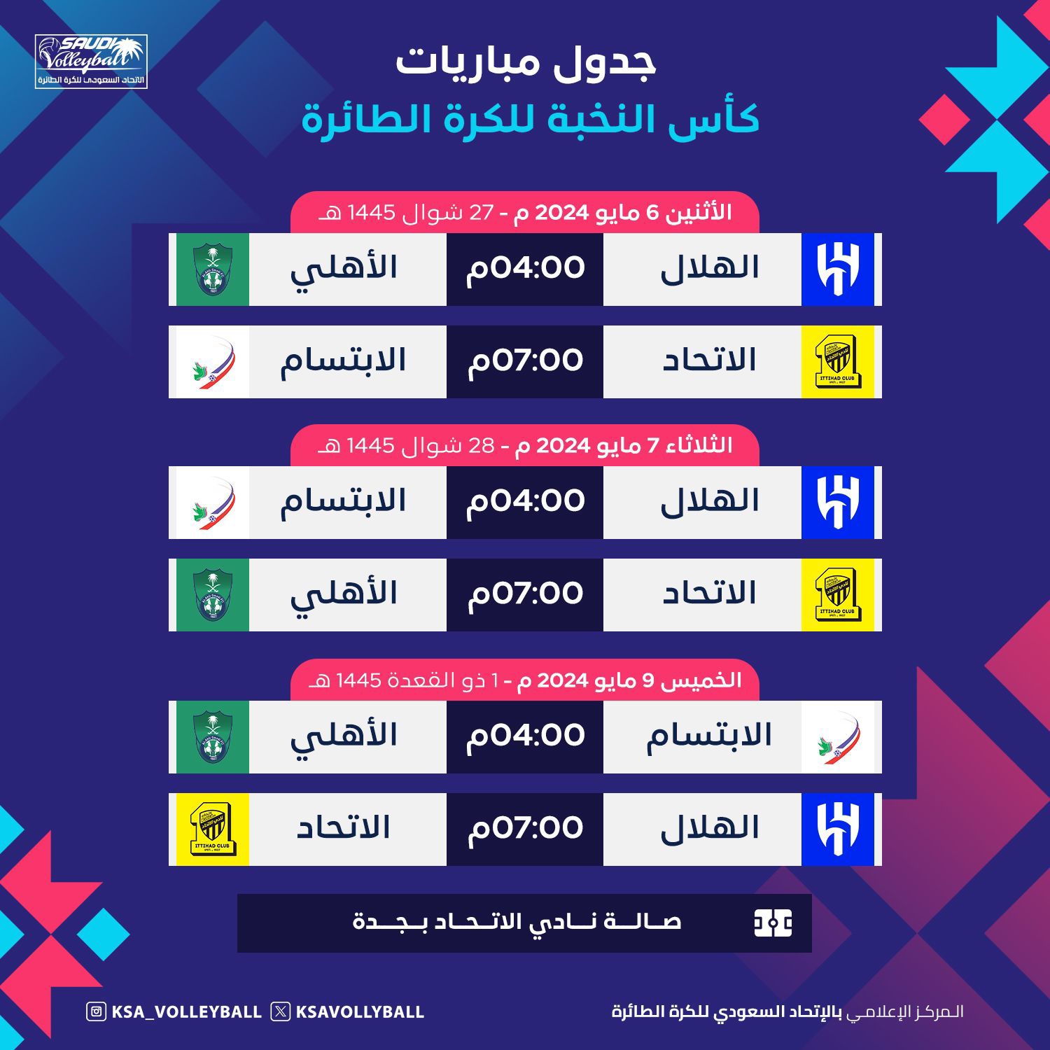 ستقوم القناة الرياضية السعودية بنقل حي ومباشر لوقائع مباريات البطولة على مدار ثلاثة ايام والتي ستقام على صالة نادي الاتحاد.