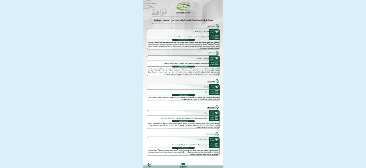 صرّح المتحدث الرسمي في هيئة الرقابة ومكافحة الفساد بأن الهيئة باشرت عدداً من القضايا الجنائية خلال الفترة الماضية، وجارٍ استكمال الإجراءات النظامية بحق مرتكبيها، وكانت