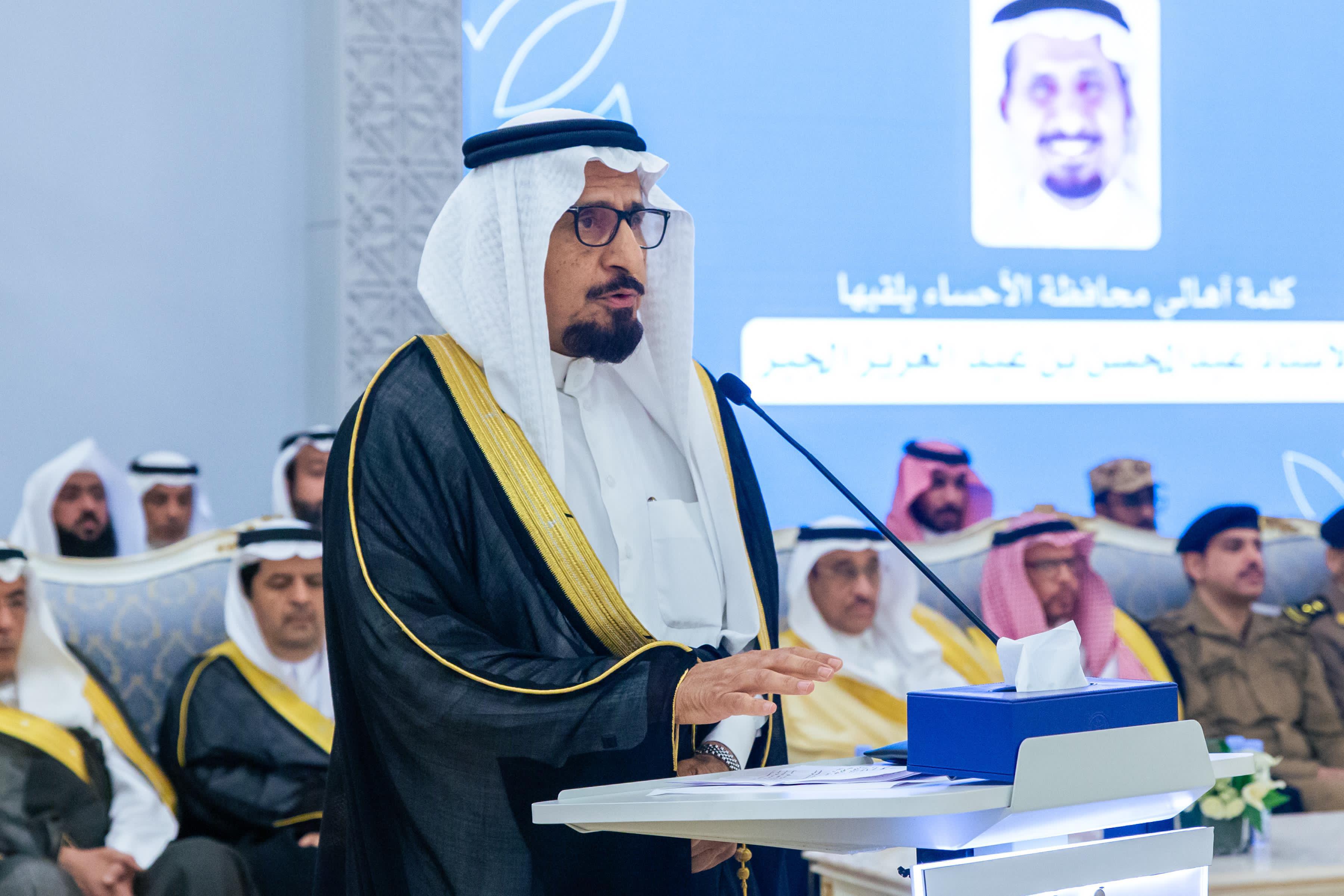واردف " من يقلب صفحات التاريخ يرى سجلاً مضيئاً وكتاباً مشرقاً ، طوى بين جوانحه مجداً مؤثلاً وفخراً سامياً ، ظل نوراً في سواد الدُّجى، من وقائع الفداء ومواقف البطولة حتى تحقق الحلم بوحدة المملكة العربية السعودية من شمالها إلى جنوبها ومن شرقها إلى غربها فالتضحية للوطن من ارقى القيم ، واشرف الأخلاق ، وأعلى الرتب فبفضل الله ثم مثل هذه المواقف لجلالة الملك المؤسس و أبنائه البررة تدفقت التنمية وقامت النهضة وحلق الوطن في سماء الرفعة والمجد ، حتى أصبحت المملكة دولة عظيمة لها ثقلها السياسي والاقتصادي وعطائها الخيري والاجتماعي ومكانتها الدولية والإقليمية ، فالأحساء جزء من هذا الوطن العزيز تميزت منذ القدم بتوافر مقومات العيش ومكتسبات البقاء واسرار الرخاء فتتابعت عليها الحضارات ووفدت اليها القبائل ، وجذبت العلماء والادباء ، ونشطت فيها التجارة والأسواق ، وتعلق بها أهلها، وانني باسم كل مواطن نبيل اشكر حكومتنا الرشيدة على ما تقدمه من خدمات جليلة كرست الامن وخلقت الرخاء ومنعت الجريمة والفساد واعبر عن شكرنا لصاحب السمو الأمير سعود بن نايف بن عبد العزيز امير المنطقة الشرقية لمتابعته وتوجيهاته الحثيثة كما اعبر عن امتناننا لسمو نائبه على هذه الزيارة الغالية التي هطل نداها الطيب على قلوبنا واحاسيسنا مقدرين لسموه الكريم الوقت والجهد والمشاعر الطيبة ، واسال الله أن يحفظنا جميعا ويحمي وطننا ويزيده عزة".