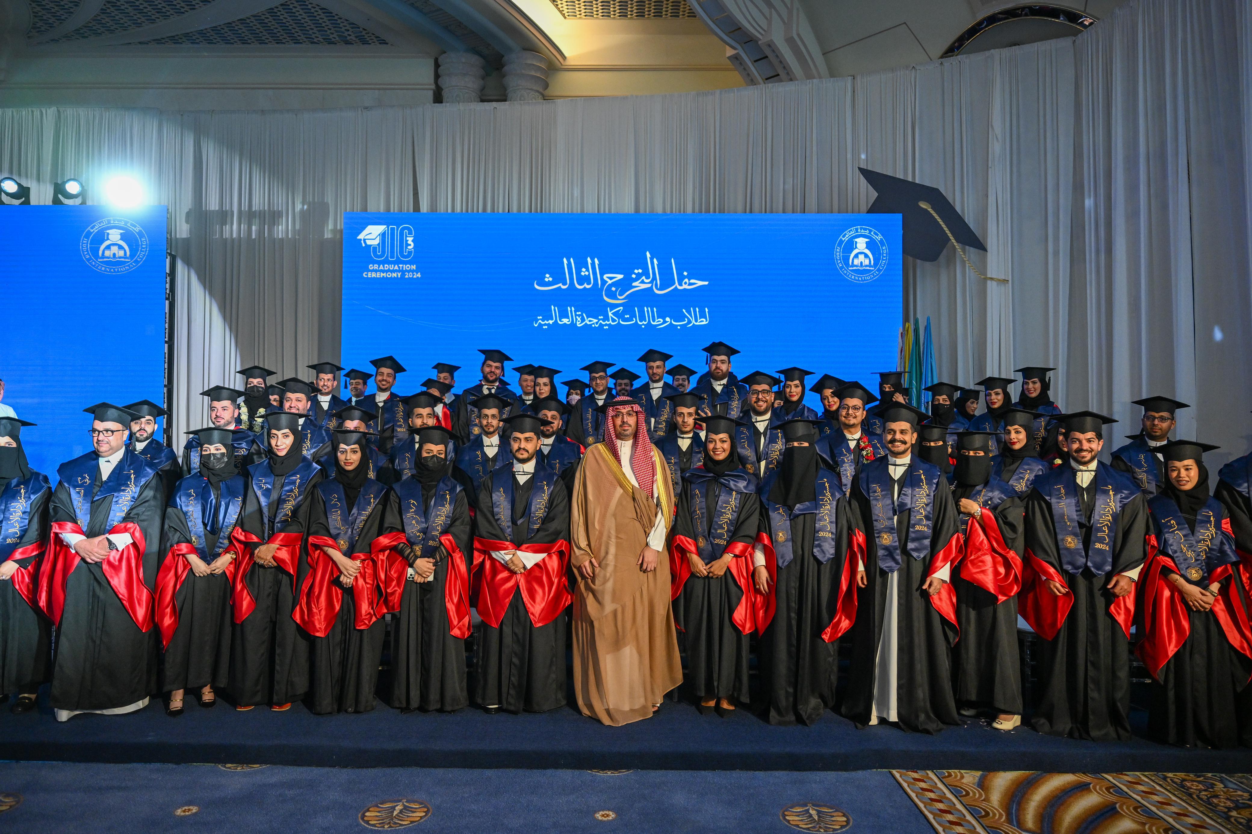 بعد ذلك ألقت الطالبة مرح تلمساني كلمة الخريجين نيابة عن طلبة الماجستير، والطالب ياسر حمدي نيابة عن طلبة البكالوريوس، عبروا فيها عن فرحتهم بتخرجهم وعزمهم على خدمة وطنهم في مختلف المجالات، معبرين عن شكرهم وتقديرهم لرعاية سموّه ولجهود الهيئة التدريسية وأولياء الأمور.