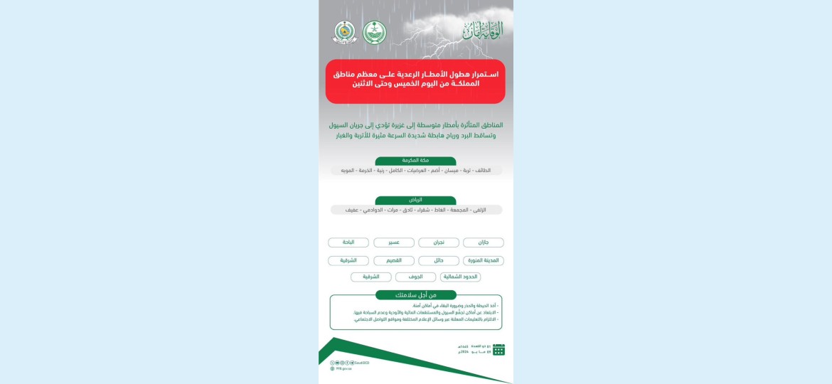 وأوضحت أن منطقة مكة المكرمة ستتأثر بأمطار متوسطة إلى غزيرة تؤدي إلى جريان السيول وتساقط البرد ورياح هابطة شديدة السرعة مثيرة للأتربة والغبار، تشمل الطائف وتربة وميسان وأضم والعرضيات والكامل ورنية والخرمة والمويه، وستتأثر منطقة الرياض لتشمل الزلفى والمجمعة والغاط وشقراء وثادق ومرات والدوادمي وعفيف بأمطار متوسطة إلى غزيرة، وخفيفة إلى متوسطة على وادي الدواسر والقويعية والسليل، ومناطق جازان ونجران وعسير والباحة والمدينة المنورة وحائل والقصيم والشرقية والجوف والحدود الشمالية.