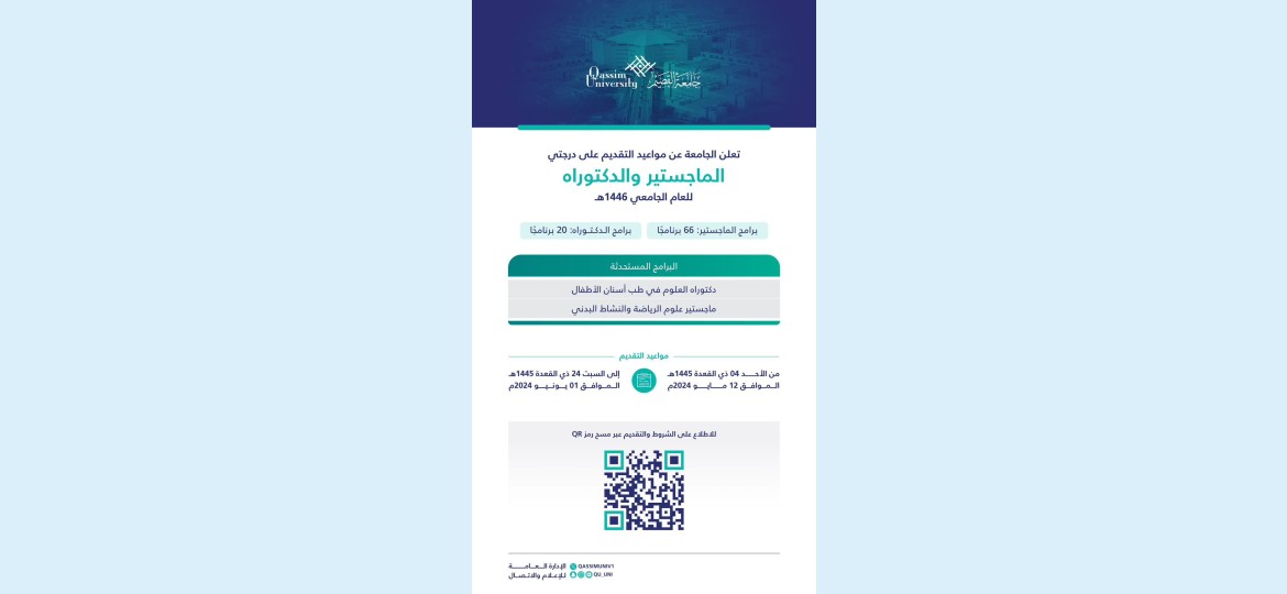 أعلنت جامعة القصيم، ممثلة بعمادة الدراسات العليا والبحث العلمي، عن موعد بدء التقديم على برامج الدراسات العليا "ماجستير ودكتوراه" للعام الجامعي المقبل 1446هـ، وذلك اعتبارًا من اليوم الأحد حتى تاريخ 1445/11/24هـ ،حيث تستقبل العمادة طلبات الراغبين في التقديم على هذه البرامج إلكترونيًا عبر البوابة الإلكترونية للجامعة.