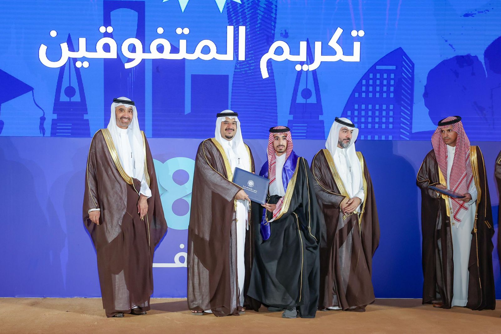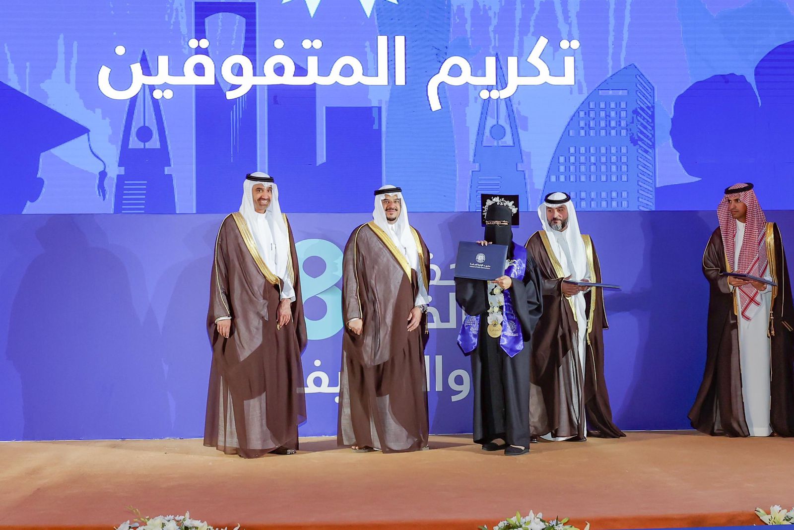 وعقب ذلك دشن سموه معرض التوظيف، ثم تشرف الخريجين المتفوقين ورعاة الحفل بتسلم تكريمهم من يدي سمو نائب أمير الرياض، والتقطت الصور الجماعية.