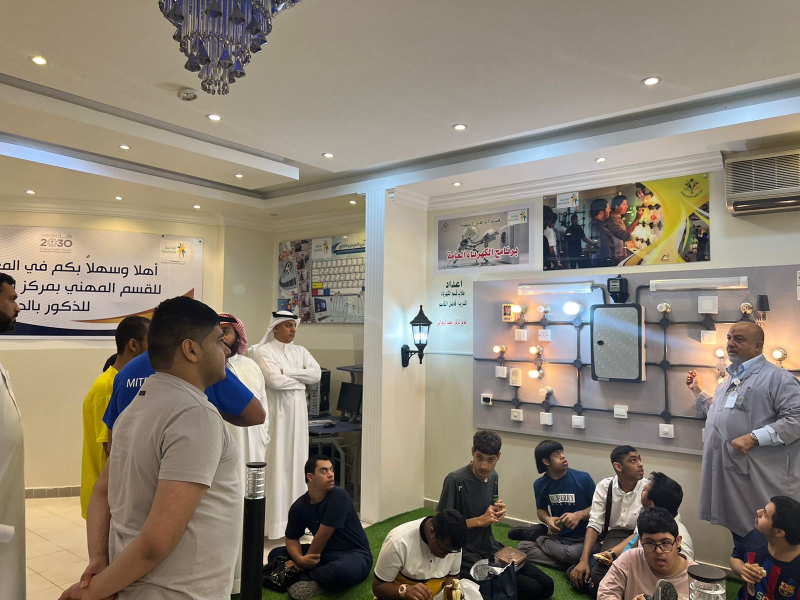 وقد قام رئيس القسم المهني عبدالمنعم المهنا بأخذ جولة بالطلاب لجميع الاقسم وهي الحاسب الالي والكهرباء والتمديدات الصحية والزراعة وتم شرح كامل لكل قسم ومايتطلبه من شروط للقبول فيه .