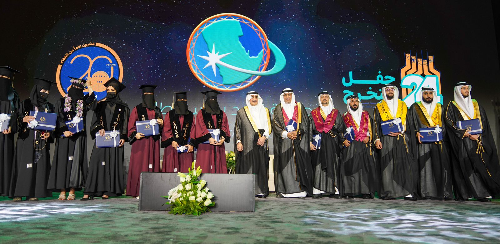 ثم شاهد سموه والحضور عرض مرئي بمناسبةمرور 20 عاماً على تأسيس الجامعة ، بعد ذلك سلم سموه وثائق التخرج لممثلي الأقسام من الخريجين والخريجات الأوائل.