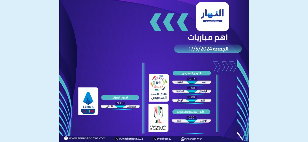 يشهد يوم الجمعة الموافق 17 من مايو الجاري، العديد من المباريات على المستوى المحلي، والتي يأتي في مقدمتها مباريات النصر والهلال، والتي نستعرضها في التالي: