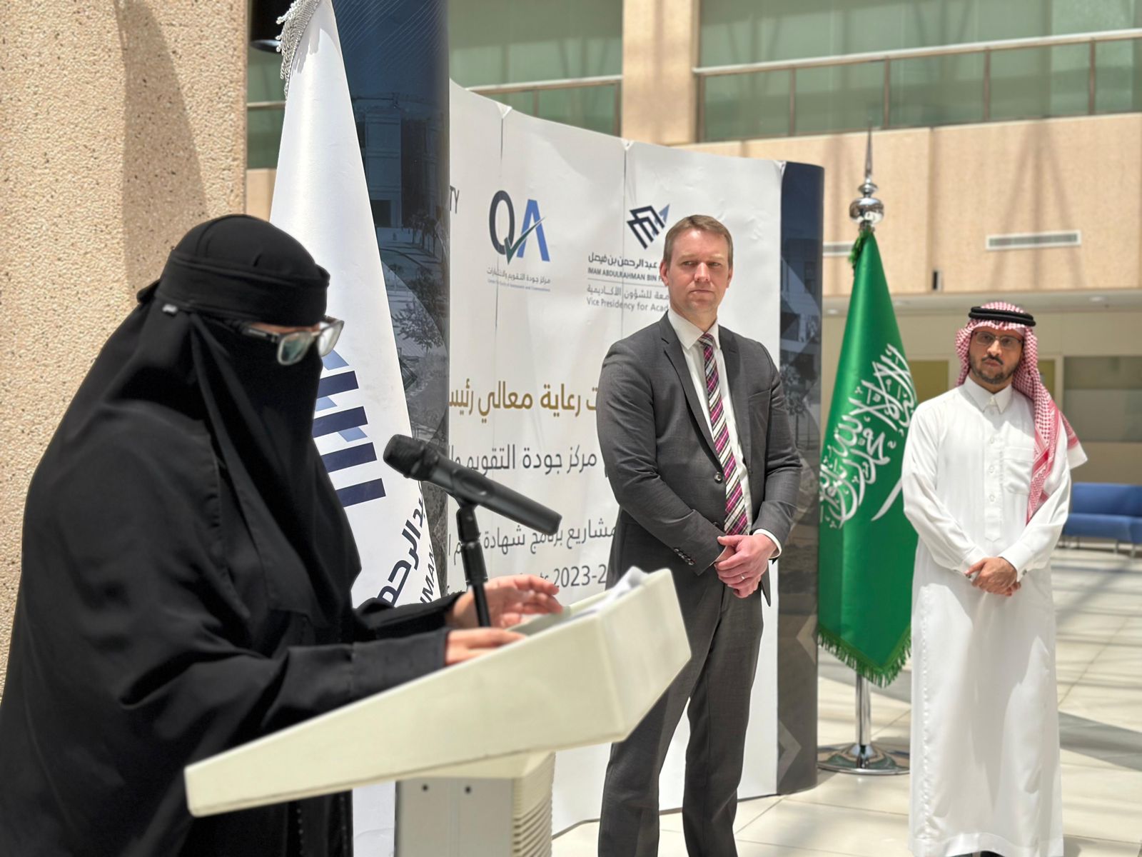 وذكر الدكتور غازي العتيبي بان هذه المشاريع هي ختام برنامج شهادة تقييم الطلاب وهو برنامج يقدم لتطوير مهارات التقويم وإعداد الاختبارات لأعضاء هيئة التدريس والهدف منه تحسين جودة التقويم والاختبارات وتدريب أعضاء هيئة التدريس على أفضل الطرق والوسائل في إعداد الاختبارات ، وهذه الدفعة الثالثة حيث قُدم البرنامج بالتعاون مع جامعة توركو الفنلندية لـ 58 من أعضاء هيئة التدريس من الجامعة يمثلون جميع كليات الجامعة، وذلك استمرارا لجهود المركز في تحسين وتجويد عملية التقويم والاختبارات. وقد قدم في المعرض 20 مشروعاً يمثل تجارب لتطبيق أدوات التقويم في الكليات وأثرها وكيف يمكن ترسيخ وتعميم هذه الممارسات المبتكرة كبديل للتقويم التقليدي الى أدوات التقويم الحديثة التي تحسن من عملية التعليم والتعلم وبالتالي جودة التعليم والمخرج.