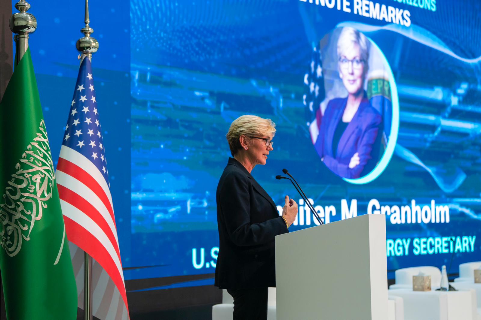 شاركت وزيرة الطاقة الأمريكية جينيفر غرانهولم بجانب السفير الأمريكي في المملكة العربية السعودية مايكل راتني ومساعد وزير الطاقة لشؤون التطوير والتميز أحمد الزهراني في برنامج الحوار الذي استمر حوالي نصف يوم وجمع بين عدد من الجهات المعنية الرئيسية في المملكة وأحدث الشركات الأمريكية الملتزمة بدعم مبادرة السعودية الخضراء وتحقيق أهداف المملكة في مجال الطاقة النظيفة.