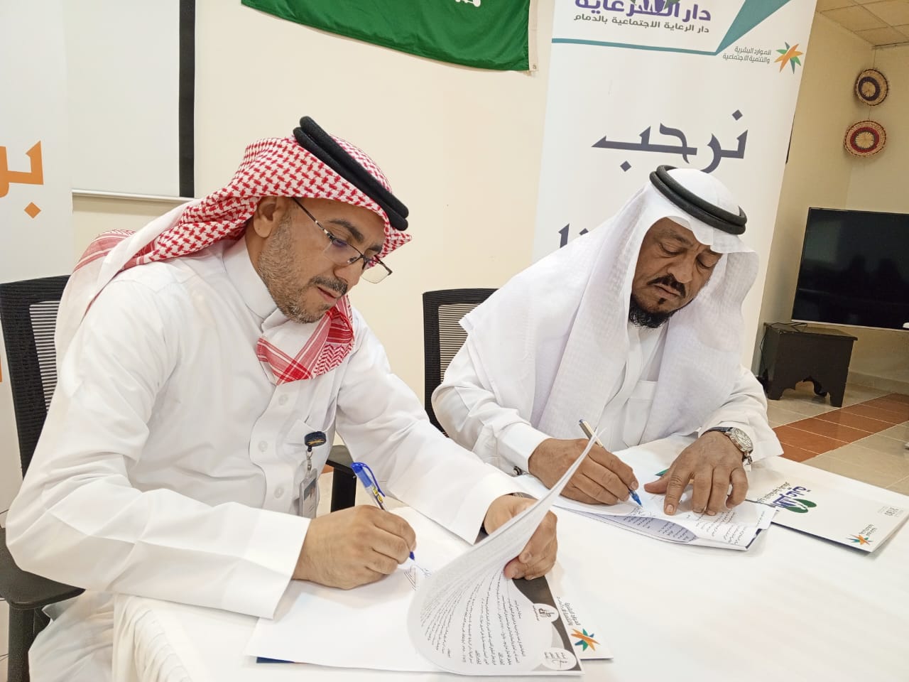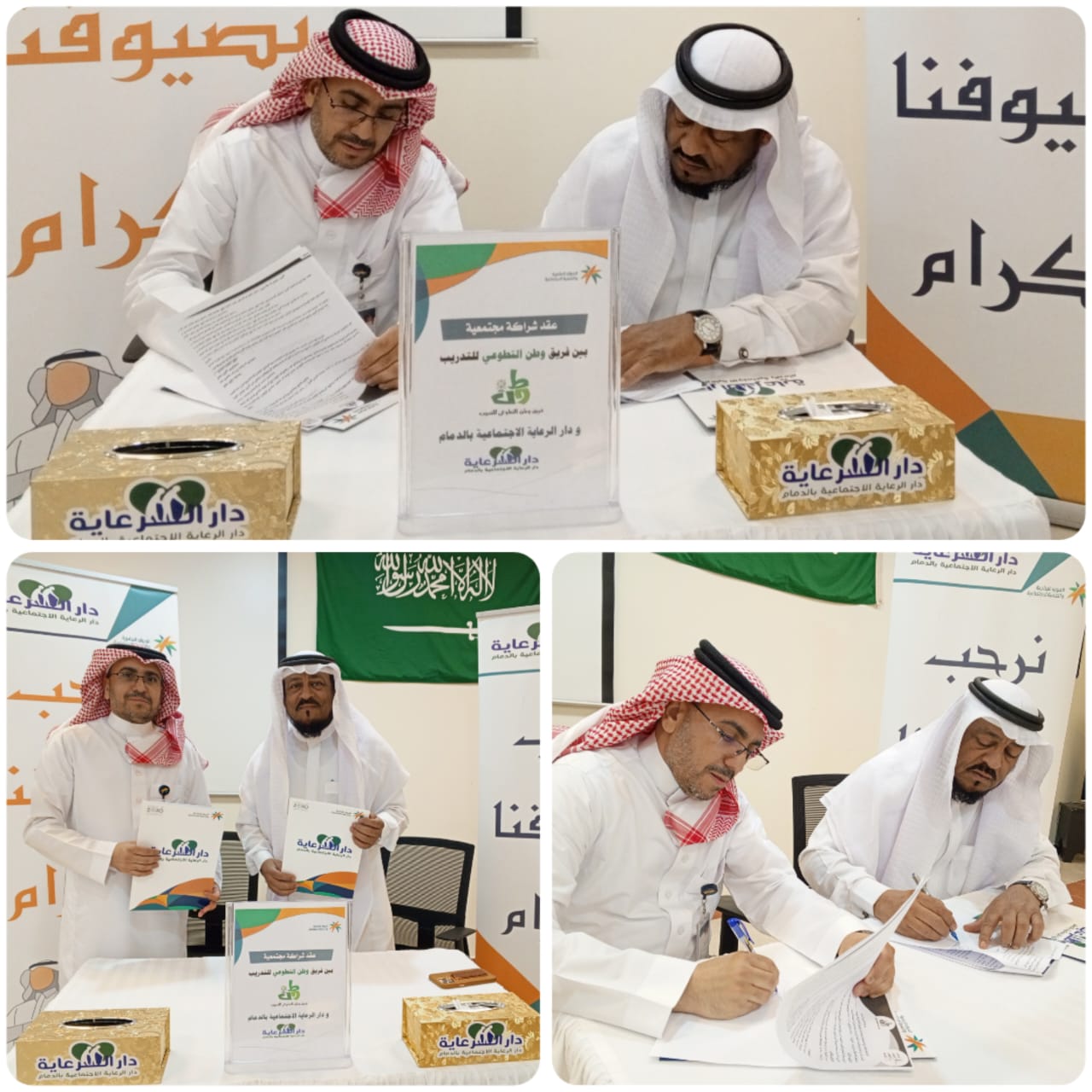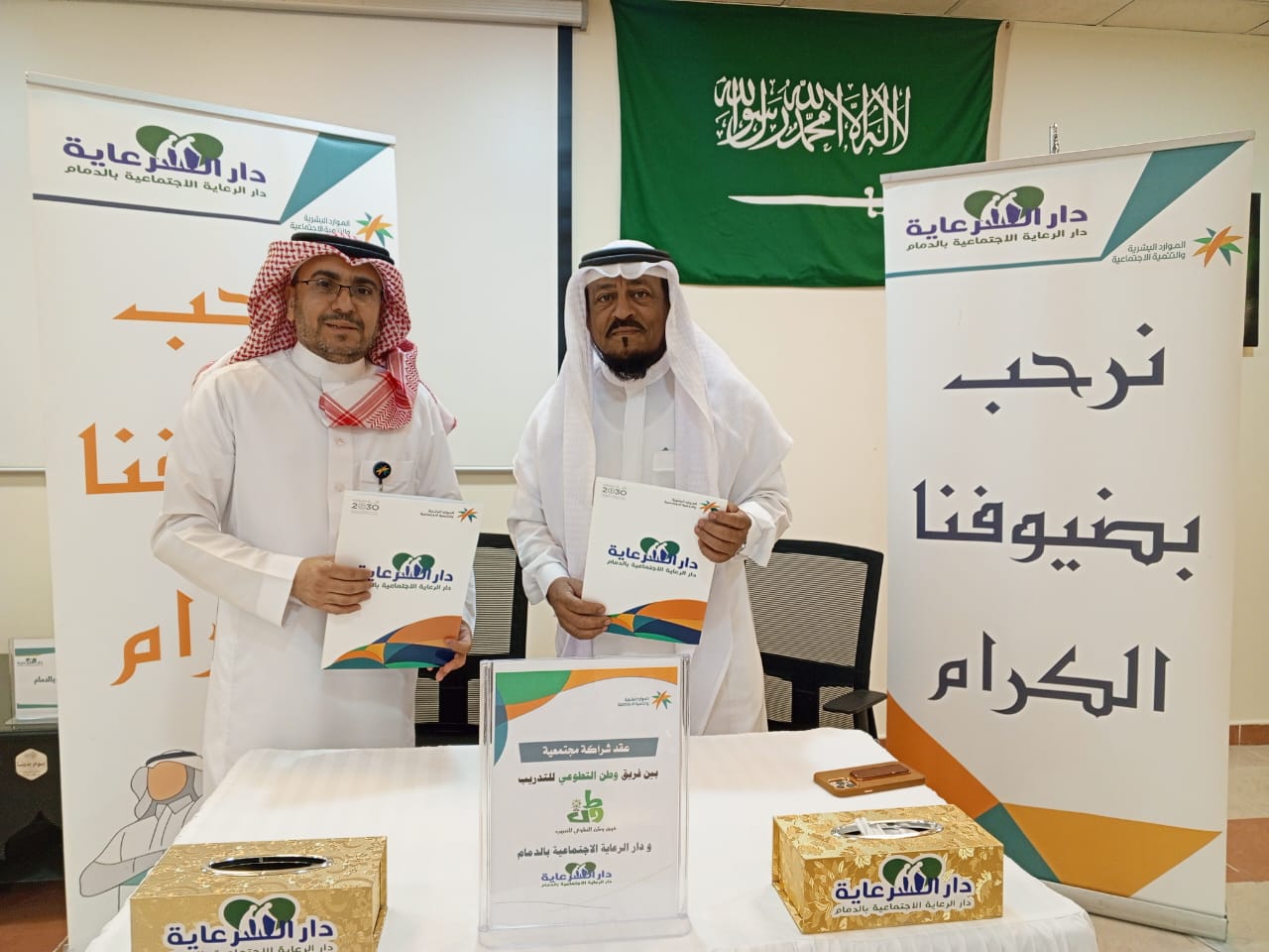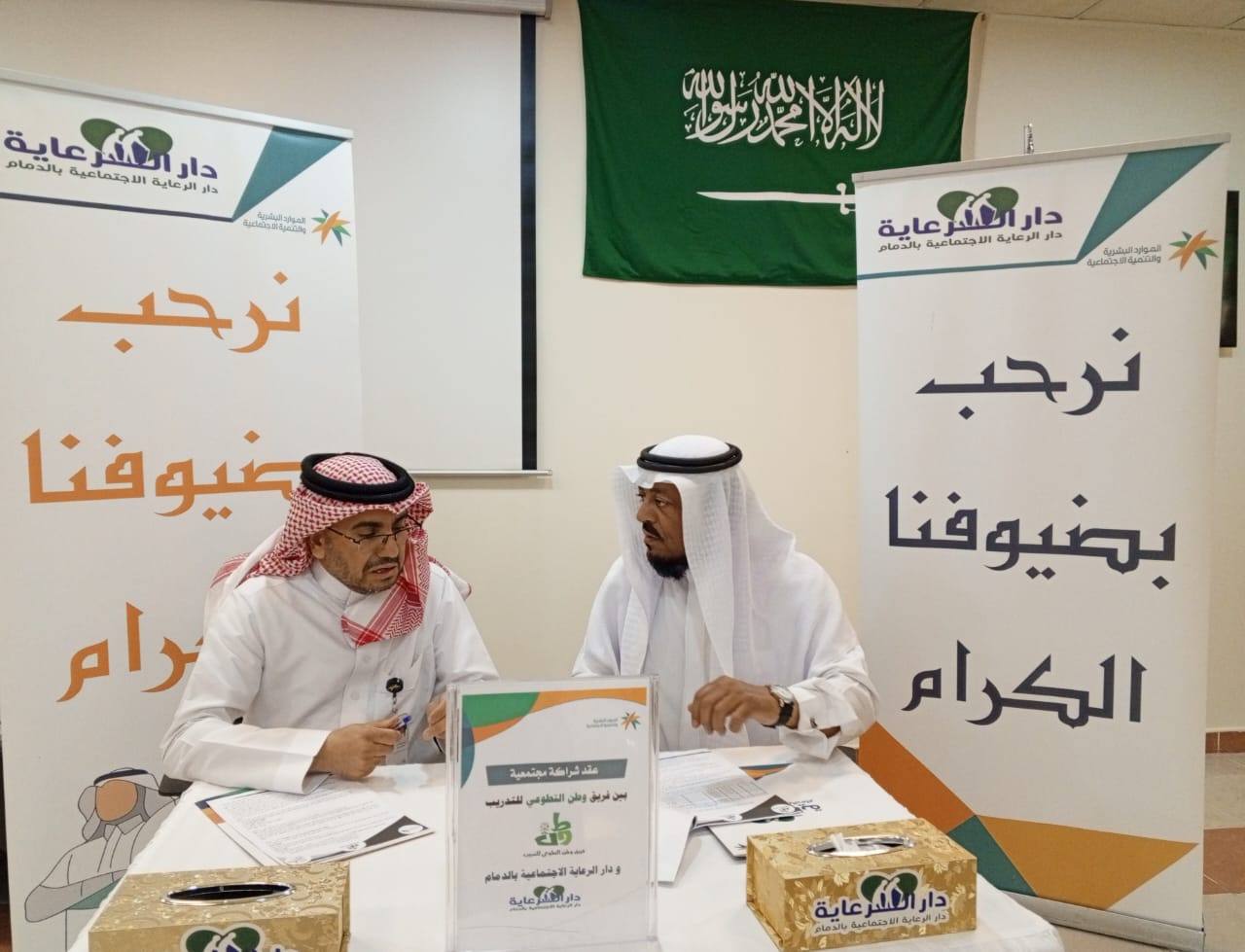 عقدت إدارة دار الرعاية الإجتماعية بالدمام التابعة لفرع وزارة الموارد البشرية والتنمية الاجتماعية بالمنطقة الشرقية، يوم الإثنين 12 ذو القعدة الموافق 20 مايو شراكة مجتمعية مع فريق " وطن التطوعي" للتدريب المعتمد بمحافظة الأحساء. ووقعت الشراكة، بحضور مدير الدار الأستاذ راضي العنزي وممثل الفريق التطوعي الأستاذ خالد بن مبارك المنصور، وبحضور مشرفين قسم العلاقات العامة وقسم التدريب والتطوير والقسم الاجتماعي وبعض منسوبي الدار. وأوضح "العنزي" قد أبرمت الشراكة بهدف إخراج وتنفيذ عدة برامج تدريبية وورش العمل والدورات التدريبية المتخصصة باختيار عناوين تخدم المنسوبين والمعتمدة كذلك، والتي تتنوع بين الإدارية والتقنية