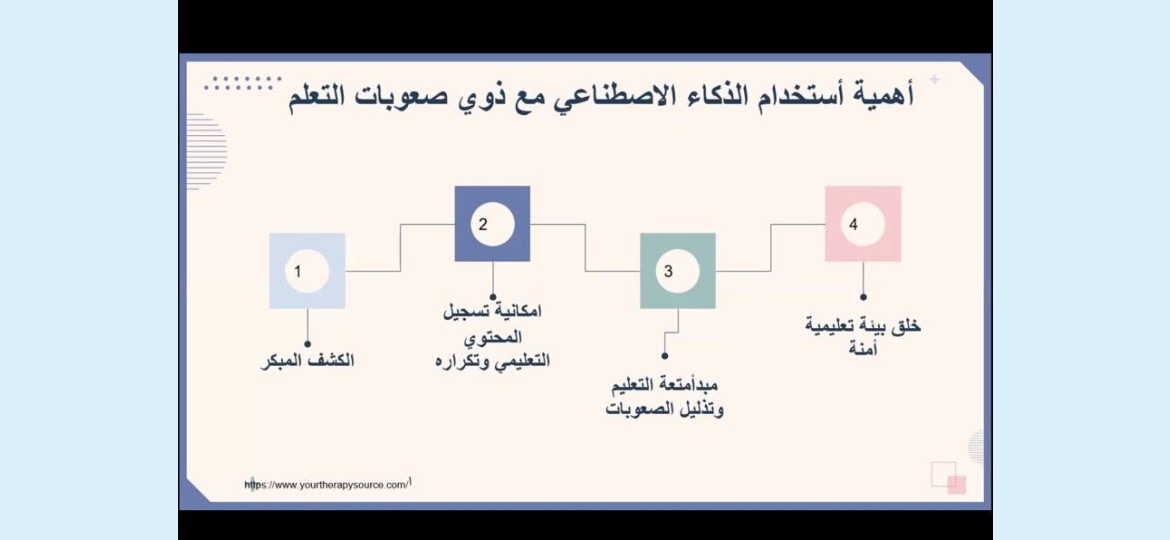 نظمت جمعية صعوبات التعلم بالتعاون مع الجمعية السعودية للتربية الخاصة (جستر) لقاءً توعويًا بعنوان (تقنية الذكاء الاصطناعي في دعم طلاب صعوبات التعلم)بمناسبة الاحتفاء باليوم الخليجي لصعوبات التعلم (عن بعد) بحضور عدد من المختصين والمهتمين وأولياء الأمور ، قدمته الدكتورة عبير الخلفي مستشار التدريب وأبحاث الإعاقة بمجمع شموع الأمل والمدرب الدولي في مجال التربية الخاصة ، فقد تناولت عدة محاور بينت فيها أن الذكاء الاصطناعي هو تقنية تحاكي الذكاء البشري على أداء المهام ويمكنه بشكل متكرر تحسين نفسه استناًد إلى المعلومات التي يجمعها واستخدامها للتنبؤ أو التوصية أو اتخاذ القرار بمستويات متفاوتة من التحكم الذاتي بهدف إنشاء أنظمة ذاتية التعلم تستخلص المعاني من البيانات، كما أشارت الخلفي أهمية استخدام الذكاء الاصطناعي مع ذوي صعوبات التعلم حيث يعمل على إثارة الدافعية والتقليل من الشعور بالإحباط وتسهل استخدام الخطة التربوية الفردية وتنوع الأساليب التدريسية ومراعاة الفروق الفردية ، كما قدمت الخلفي عدد من التوصيات منها: ضرورة تدريب المعلمين على استخدام الذكاء الاصطناعي في تقديم الدروس لذوي صعوبات التعلم وتطوير برامج تعليمية قائمة على الذكاء الاصطناعي وتحفيز وتشجيع المبدعين في هذا المجال، استخدام الذكاء الاصطناعي في تشخيص ذوي صعوبات التعلم، بناء وتصميم برامج علاجية إرشادي قائمة على الذكاء الاصطناعية في البيئة العربية.