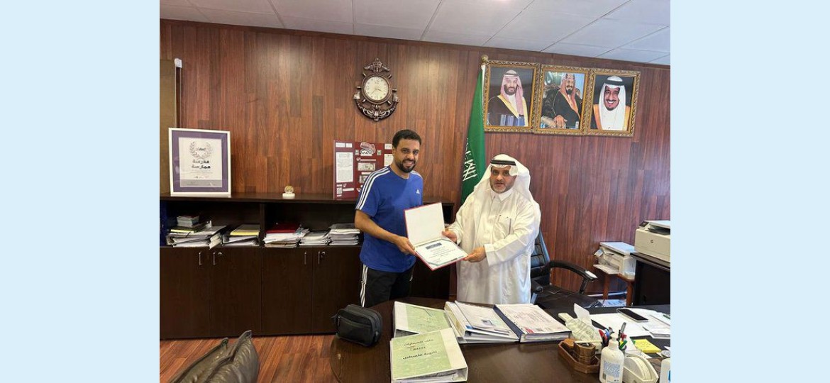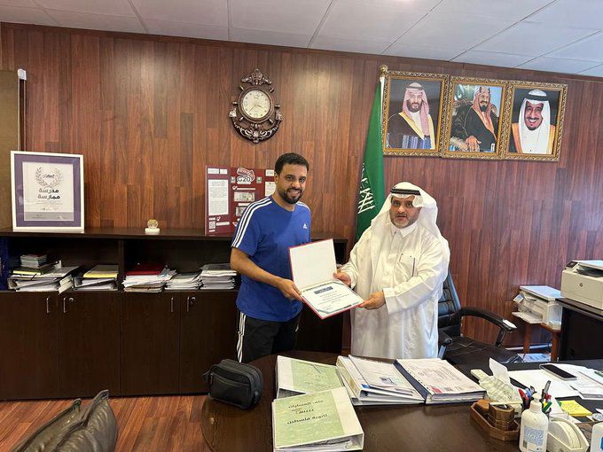 كرم مدير مدرسة فلسطين الثانوية جدة، الاستاذ محمد دحمان ابوهبشة، الاستاذ علي الأحمدي، معلم التربية البدنية بشهادة شكر وتقدير من إدارة أداء التعليم نظير جهوده المتميزة في عمله والتعاون مع إدارة المدرسة.