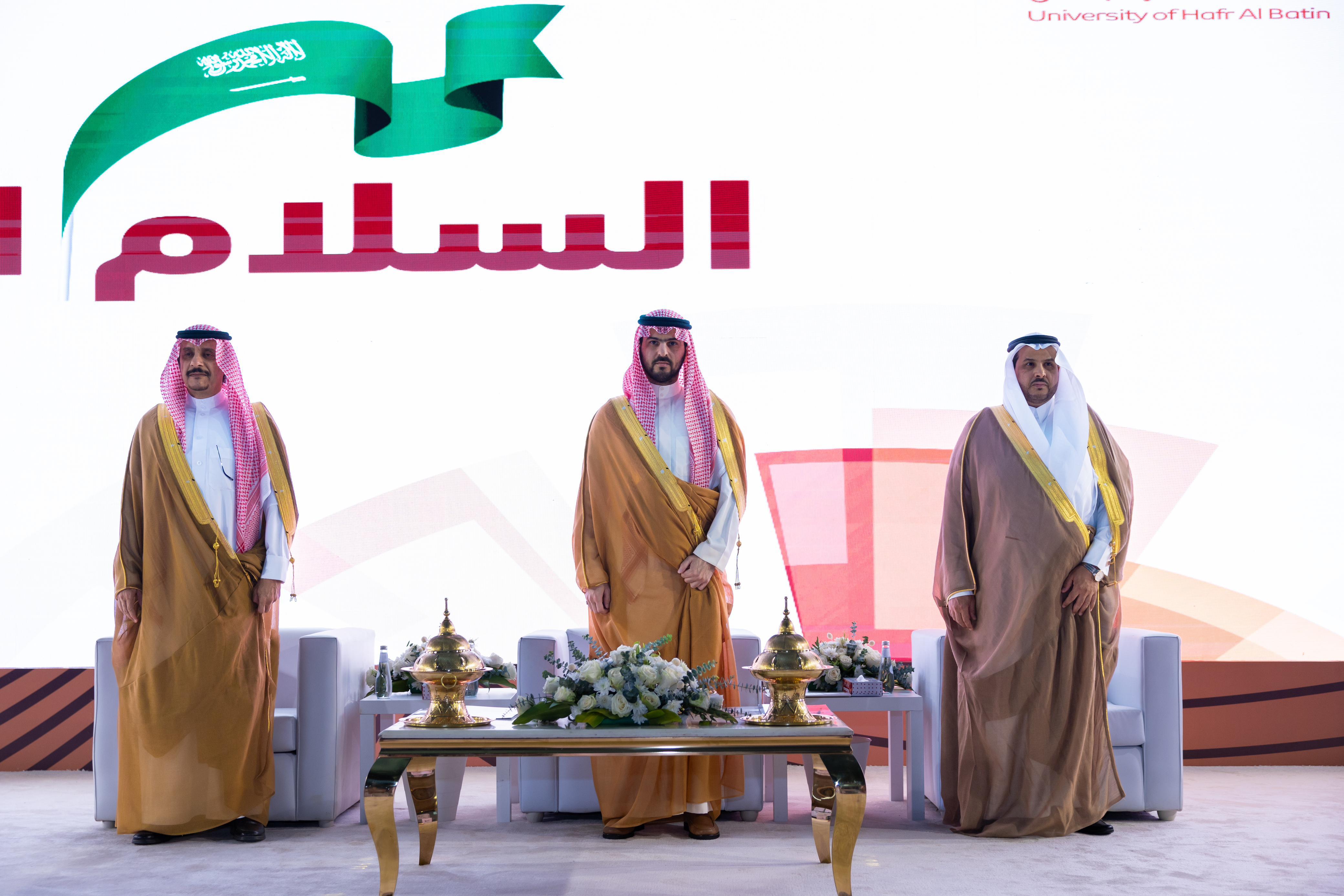 وكان في استقبال سموه لدى وصوله مقر الحفل سعادة رئيس جامعة حفر الباطن الأستاذ الدكتور خالد بن باني الحربي، ووكلاء الجامعة.