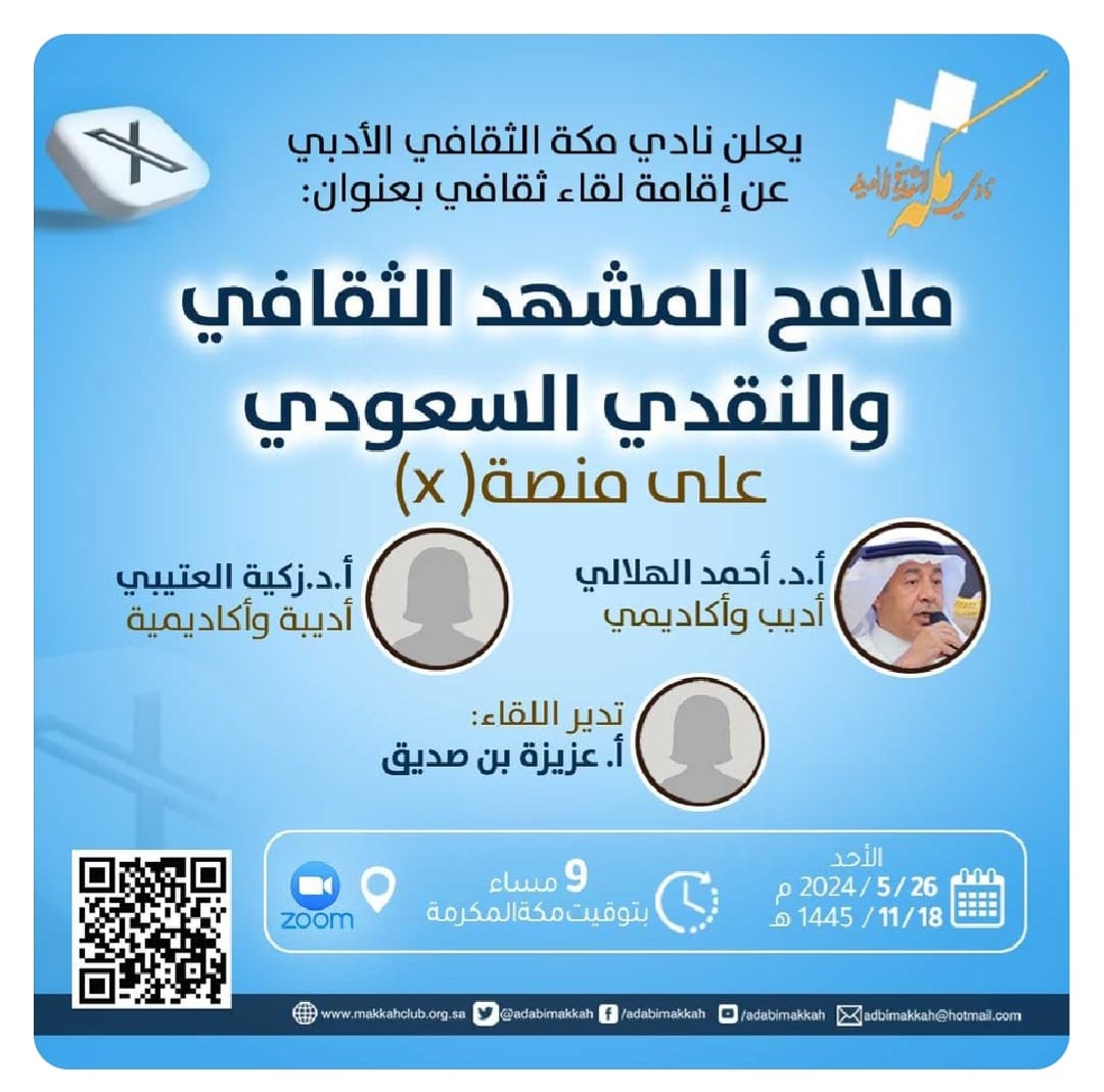 يقيم نادي مكة الثقافي الأدبي يوم الأحد بتاريخ 2024/5/26م 1445/11/18هـ بمقر النادي بحي العزيزية في تمام الساعة التاسعة مساءاً لقاء ثقافي بعنوان: ملامح المشهد الثقافي والنقدي السعودي على منصة ( x ) بمشاركة كلاً من: الدكتور أحمد الهلالي أستاذ الأدب والنقد بجامعة الطائف بورقة بعنوان: حضور المؤسسات الثقافية والمثقفين على منصة ( X ) ومعه الدكتورة زكية العتيبي استاذة البلاغة والنقد الأدبي بجامعة الأميرة نورة بنت عبد الرحمن بورقة بعنوان: نقد السينما السعودية على منصة ( x ) تلقي الجمهور السعودي لفيلم أغنية الغراب أنموذجًا ويدير اللقاء المحاورة المتألقه الأستاذة عزيزه بن صديق ويأتي هذا اللقاء ضمن انشطة النادي الثقافية والأدبية على مدار السنة تحت إشراف الدكتور سامي الثقفي المشرف على أنشطة وبرامج النادي ووضع النادي رابط المحاضرة عبر برنامج الزوم لمن يرغب بمتابعته ZOOM us06web.zoom.us/j/82748561708