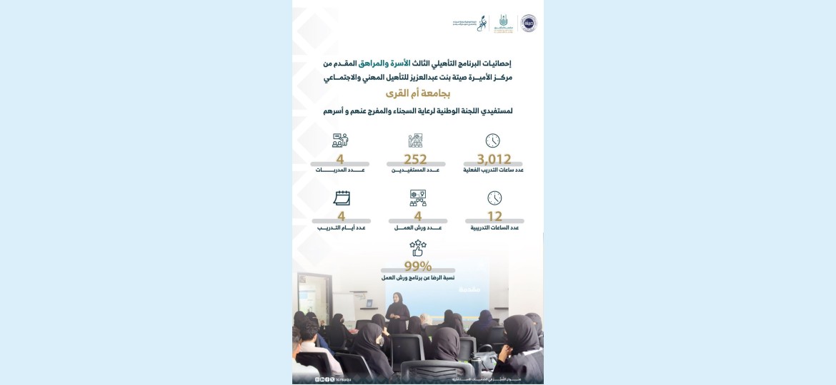 اختتم مركز الأميرة صيتة بنت عبد العزيز للتأهيل المهني والاجتماعي بجامعة أمِّ القرى البرنامج التدريبي الثَّالث المقدَّم لمستفيدي اللجنة الوطنيَّة لرعاية السُّجناء والمُفرَج عنهم وأسرهم (تراحم)؛ بعنوان: (الأسرة والمراهق)؛ والمقام في الفترة من: 24/4/2024م إلى 12/5/2024م؛ بهدف التمكين الاجتماعي والمهني للفئة المستهدفة، وتعزيز المهارات المختلفة لهم.