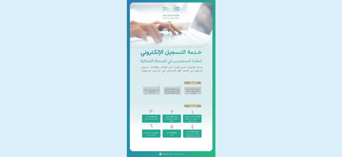 وتسهم الخدمة الإلكترونية الجديدة في تنظيم آلية التسجيل والقبول في أكثر من 12 ألف مدرسة ابتدائية حكومية في المملكة، ومن المتوقع أن يستفيد منها أكثر من 450 ألف طالب وطالبة، حيث تهدف لتطوير وتحسين تجربة أولياء الأمور في تسجيل أبنائهم إلكترونياً دون مراجعة المدرسة،