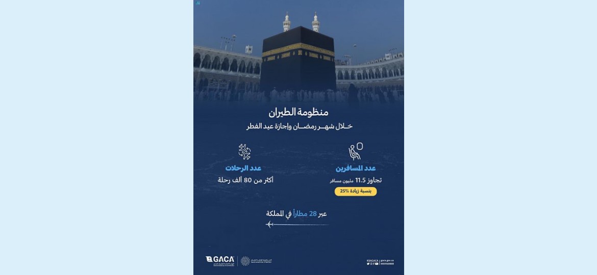 أعلنت الهيئة العامة للطيران المدني عن أعداد المسافرين من مطارات المملكة وإليها خلال شهر رمضان وإجازة عيد الفطر المبارك لعام 1444هـ، حيث تجاوزت الأعداد 11.5 مليون مسافر من بداية شهر رمضان وحتى التاسع من شوال تحت شعار "خدمتكم شرف"، الذي انعكس على أرض الواقع بانسيابية ملحوظة وتكامل تشغيلي بين الجهات الحكومية والخاصة كافة بزيادة تجاوزت 25% عن العام الماضي في نفس الفترة.