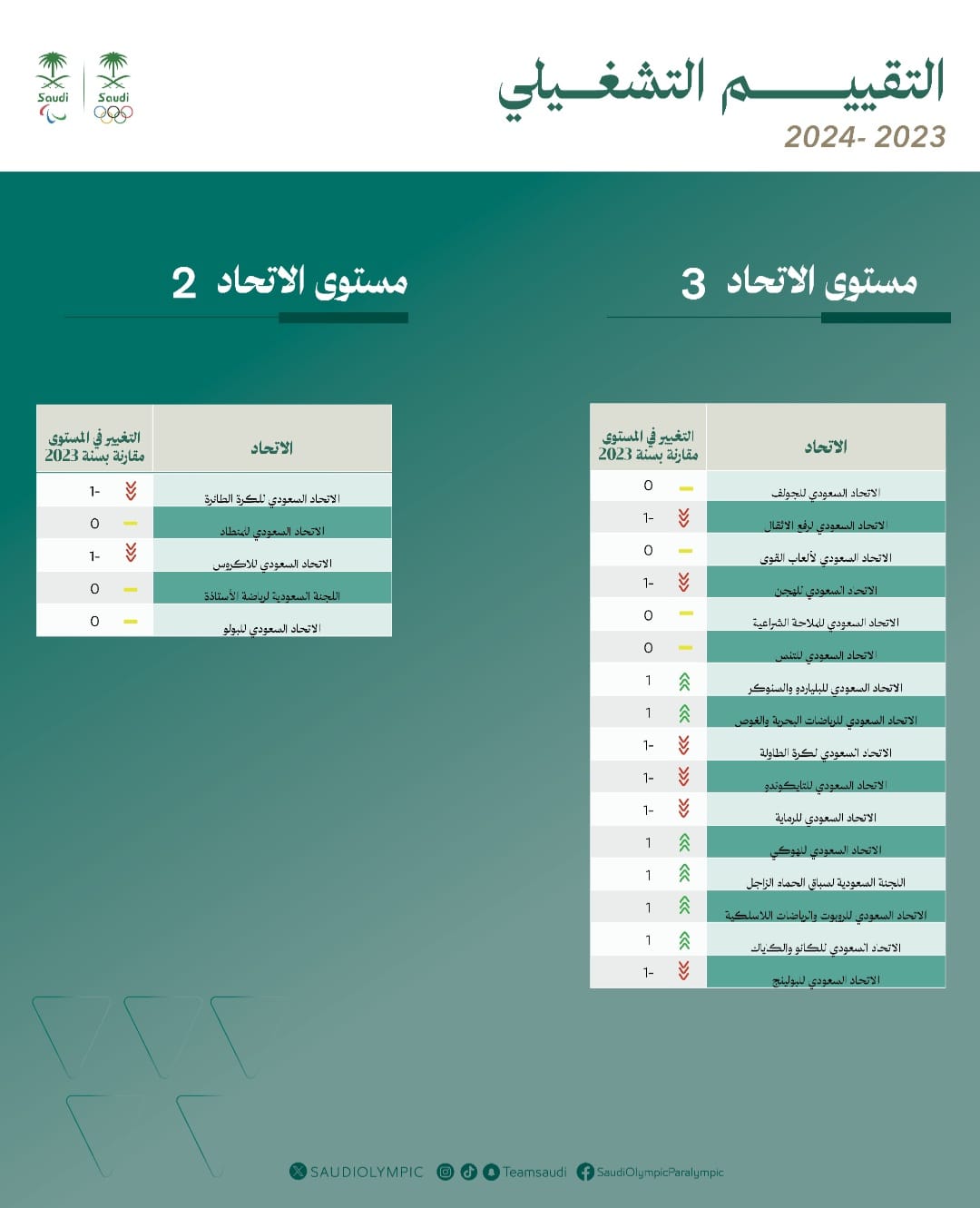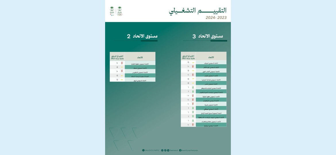 أعلنت اللجنة الأولمبية والبارالمبية السعودية نتائج التقييم التشغيلي الأول لعام 2024م الخاص باستراتيجية دعم وتطوير الاتحادات الرياضية للفترة الزمنية من مارس 2023م وحتى شهر مارس للعام الحالي بعد تدشينها في نوفمبر 2021م بميزانية تقدر بمليارين و600 مليون ريال سعودي كإحدى مبادرات برنامج جودة الحياة الرامية لإحداث نقلة تطويرية في الاتحادات الرياضية السعودية.
