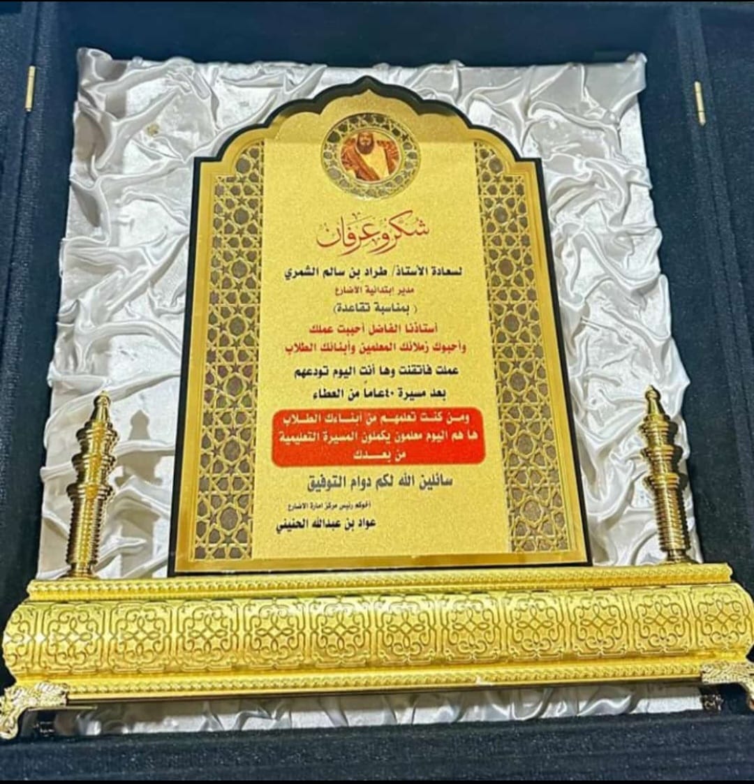 كرم رئيس مركز الاضارع بمنطقة الجوف الأستاذ عواد بن عبدالله الحنيني مدير ابتدائية الأضارع الأستاذ طراد بن سالم الشمري بمناسبة تقاعده نهاية العام الدراسي للعام 1445 هـ ، وذلك بعد خدمته في قطاع التعليم لأكثر من 40 عام بمسيرة حافلة بالبذل و العطاء في خدمة الطلاب و المعلمين والذي عكس الثناء على جهود المعلم طيلة سنوات خدمته .