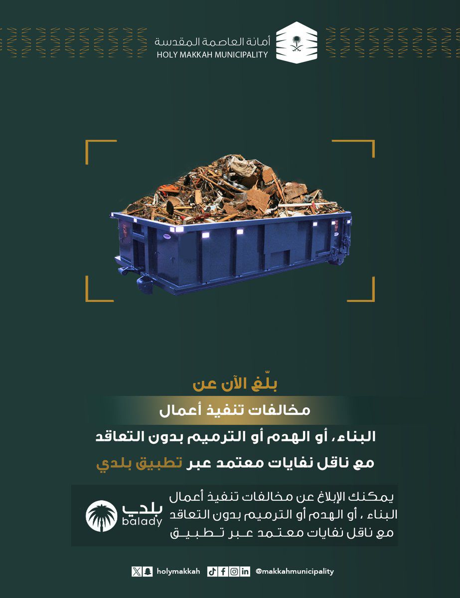 شددت أمانة العاصمة المقدسة على المقاولين وملاك المباني التي تحت الانشاء بضرورة التعاقد مع ناقل نفايات وفق ما ورد بدليل "اشتراطات التخلص من نفايات البناء والهدم والترميم" الصادر عن وزاره الشؤون البلدية والقروية والاسكان ، وذلك لضمان إتمام البناء بصورة نظامية والتخلص من مخلفات البناء بالطرق السليمة ، وضمن مساعيها للحد من التشوه البصري، وضبط إدارة نفايات البناء والهدم والترميم وتنظيمها، ووضع آليات التخلص النظامي منها وفق معايير موحدة، مؤكدة على أهمية الالتزام بتطبيق ما ورد في الدليل؛ من أجل تحسين المشهد الحضري، والحفاظ على الممتلكات والحد من التعدي على المرافق العامة والشوارع والأراضي الفضاء ، وتعزيز مستوى الوعي بالأنظمة واللوائح والاشتراطات البلدية ورفع معدلات الامتثال.