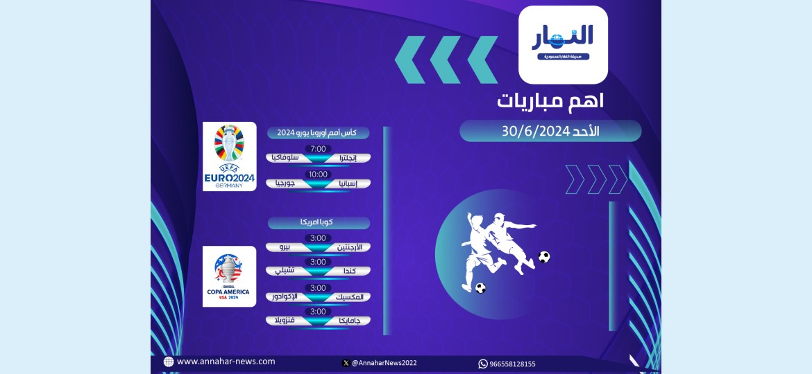 وفي إطار خدماتها الرياضية التي تقدمها صحيفة النهار السعودية، نستعرض جدول مباريات مباريات الأحد 30 يونيو 2024 على مستوى العالم، وهي تتمثل في التالي: