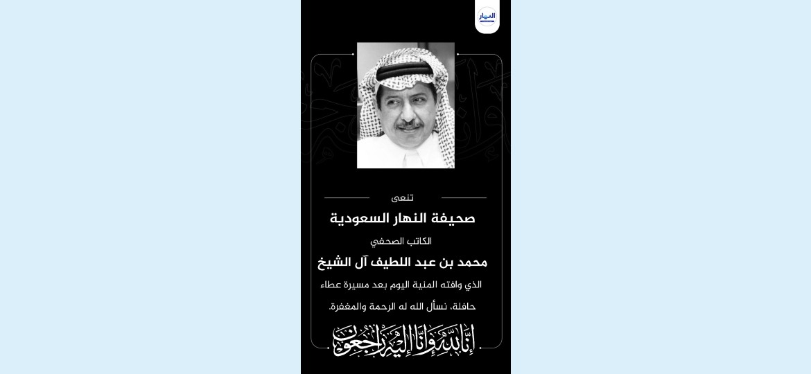 تنعى صحيفة النهار السعودية الكاتب الصحفي محمد بن عبد اللطيف آل الشيخ، الذي وافته المنية اليوم بعد مسيرة عطاء حافلة، نسأل الله له الرحمة والمغفرة.. إنا لله وإنا إليه راجعون.