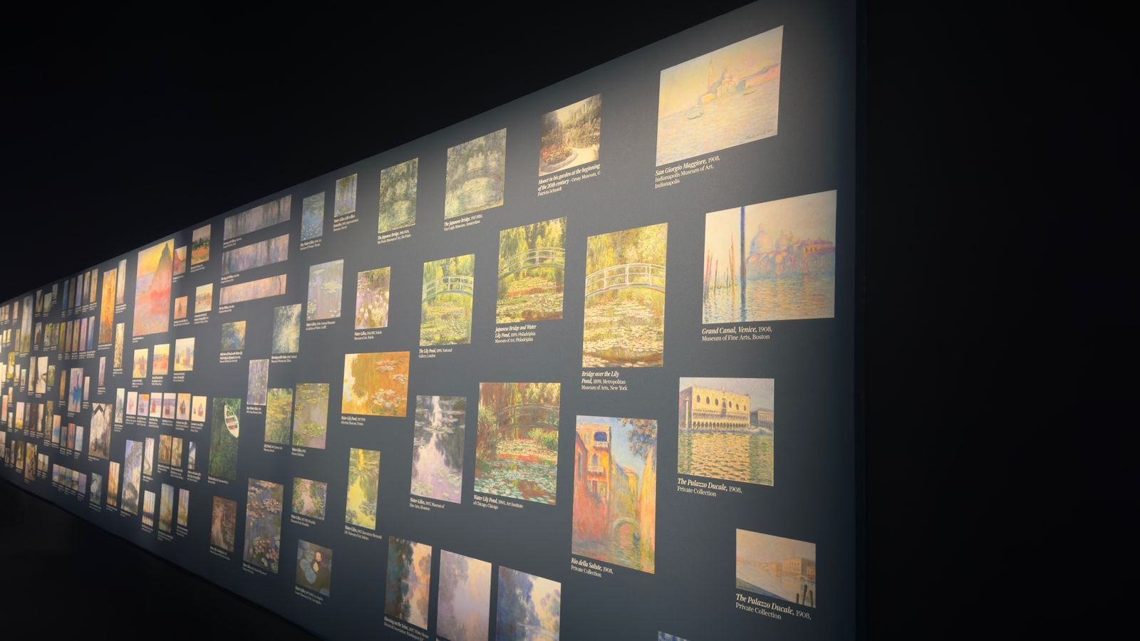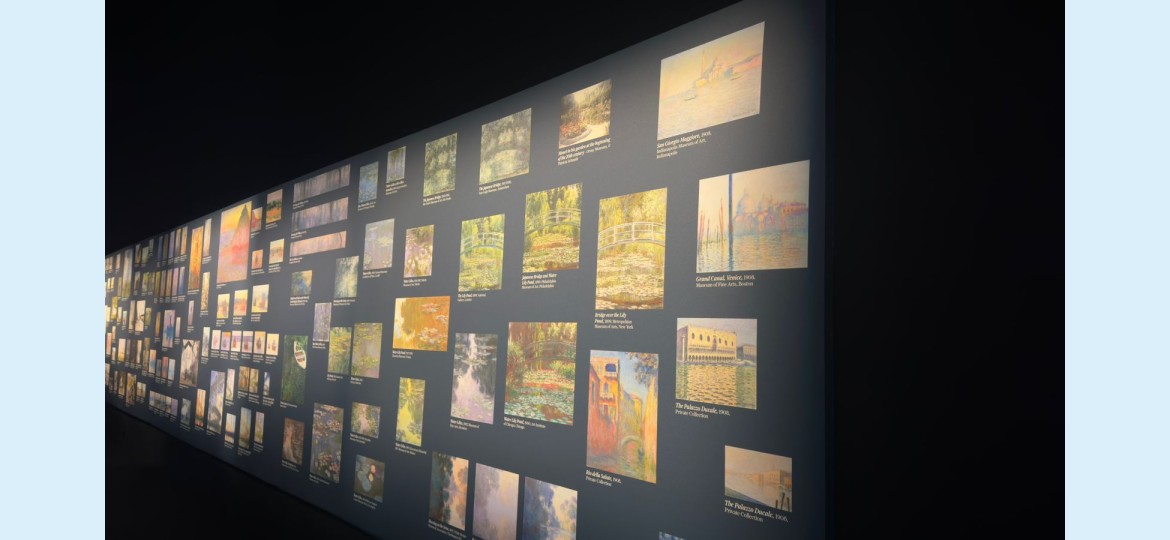 ومن روعة هذا الرسام العالمي حتى حين أصيب بالعمى بفقده لبصره في مرحلة من عمره لم يترك الرسم بل كان الإبداع ملازم له، وفي هذا المعرض حيث خصصت لأشهر رسوماته مساحة كبيرة أشبه بغرفة مغلقة تحيط بها الجدران من كل الجهات وتظهر عليها رسوماته الإنطباعية بطريقة خيالية على كامل واجهات جدران الغرفة مع السقف والأرضية وتموج بالناظر للحائط بطريقة تفاعلية كما اسلفنا ثنائية الأبعاد.