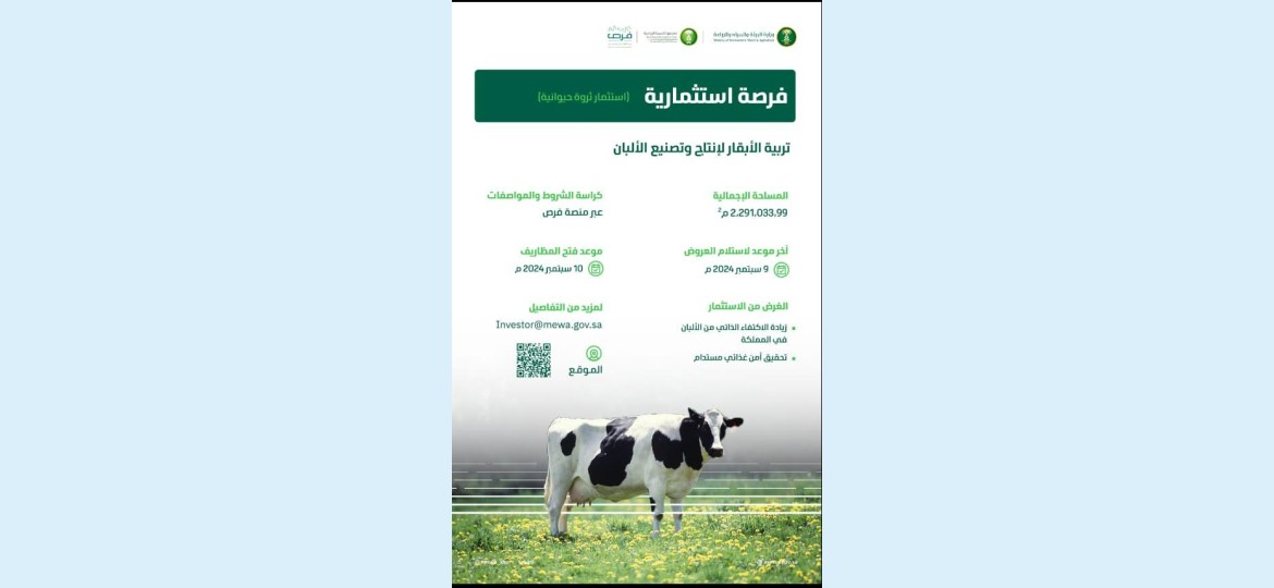 أعلنت وزارة البيئة والمياه والزراعة عن طرح فرصة استثمارية لتربية الأبقار في مركز حلي بمحافظة القنفذة بمنطقة مكة المكرمة بمساحة إجمالية تقدر بـ (2.291.033.99م2) بهدف الاكتفاء من إنتاج وتصنيع الألبان بالمملكة والمساهمة في تحقيق أمن غذائي مستدام.