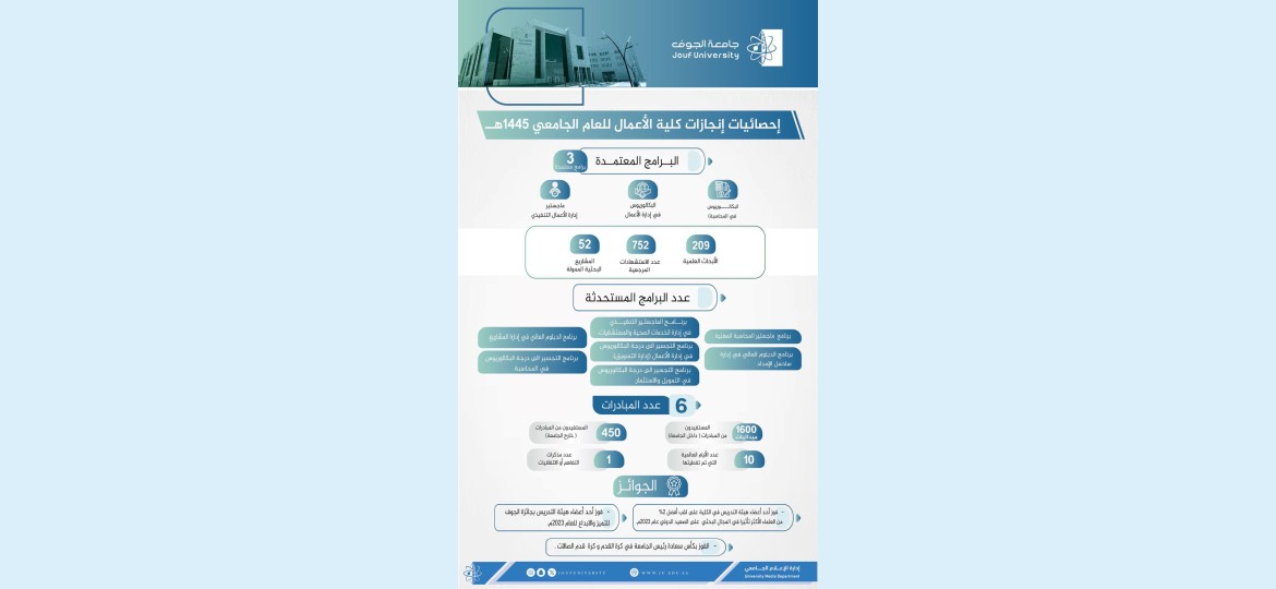 وبينت جامعة الجوف أن منجزات الكلية خلال العام الجامعي 1445 هـ تضمنت نشر 209 أبحاث علمية وإجراء 752 استشهاداً مرجعياً ، كما مولت الكلية 52 مشروعاً بحثياً .