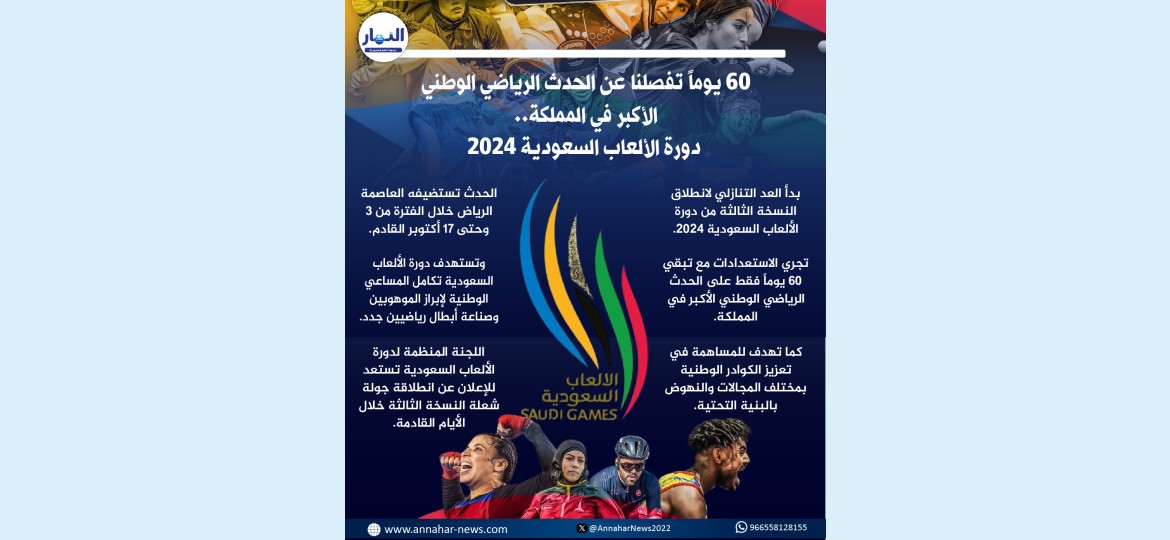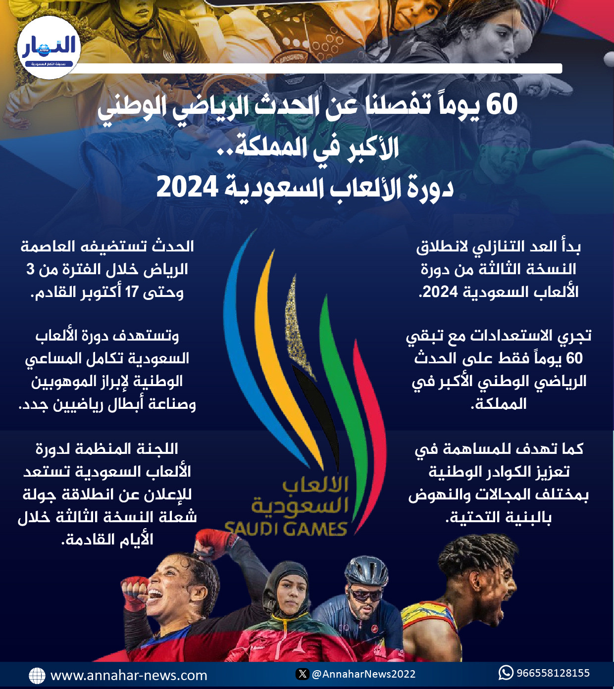 بدأ العد التنازلي لانطلاق النسخة الثالثة من دورة الألعاب السعودية 2024، حيث تجري الاستعدادات على قدم وساق مع تبقي 60 يوماً فقط على الحدث الرياضي الوطني الأكبر في المملكة، والذي تستضيفه العاصمة الرياض خلال الفترة من 3 وحتى 17 أكتوبر القادم.