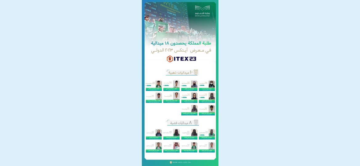 تُهنئ الإدارة العامة للتعليم بمنطقة مكة المكرمة طلابها الحاصلين على الميدالية الذهبية في معرض آيتكس 2023 الدولي للاختراع والابتكار والتكنولوجيا والمقام في العاصمة الماليزية كوالا لمبور خلال الفترة من 7-14 مايو 2023 م، حيثُ حصل كُلاً من الطالب عبد الإله بن محمد بن رعيدان والطالبة غلا بنت متعب النفيعي في مجال علوم البيئة على ميداليتين ذهبية بالإضافة إلى جائزة خاصة.