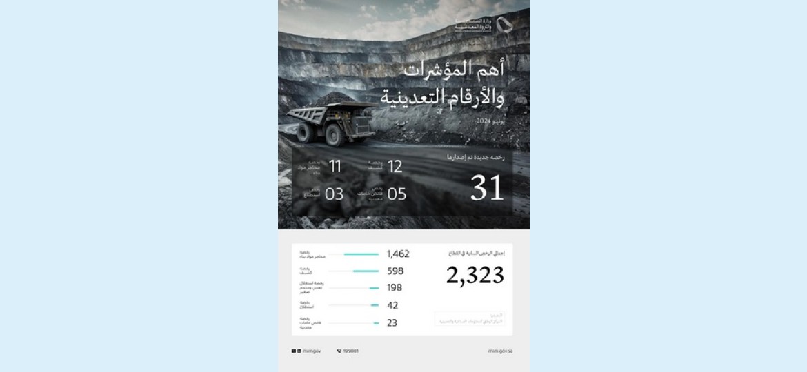 أصدرت وزارة الصناعة والثروة المعدنية 31 رخصة تعدينية جديدة خلال شهر يونيو 2024، شملت 12 رخصة كشف و11 رخصة محجر مواد بناء، و 5 رخص فائض الخامات المعدنية و 3 رخص استطلاع، وذلك وفقاً لتقرير المركز الوطني للمعلومات الصناعية والتعدينية التابع للوزارة.