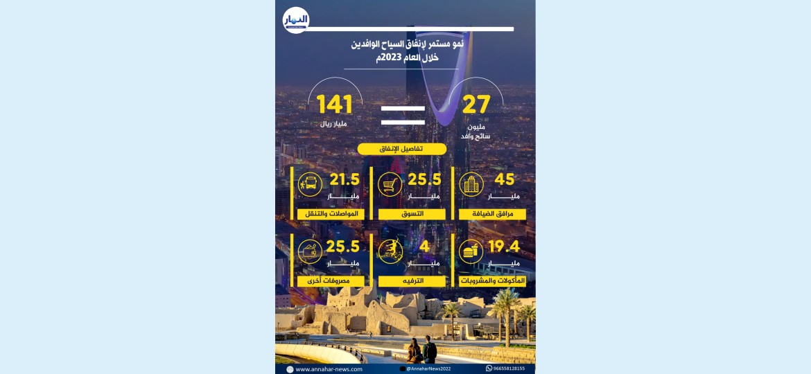 يذكر أن عدد السياح الوافدين إلى المملكة من الخارج خلال العام 2023م، تجاوز (27 مليون) سائح وبلغ إجمالي إنفاقهم أكثر من (141 مليار ريال)، كما تجاوز عدد السياح المحليين والوافدين خلال العام الماضي (109 ملايين) سائح.