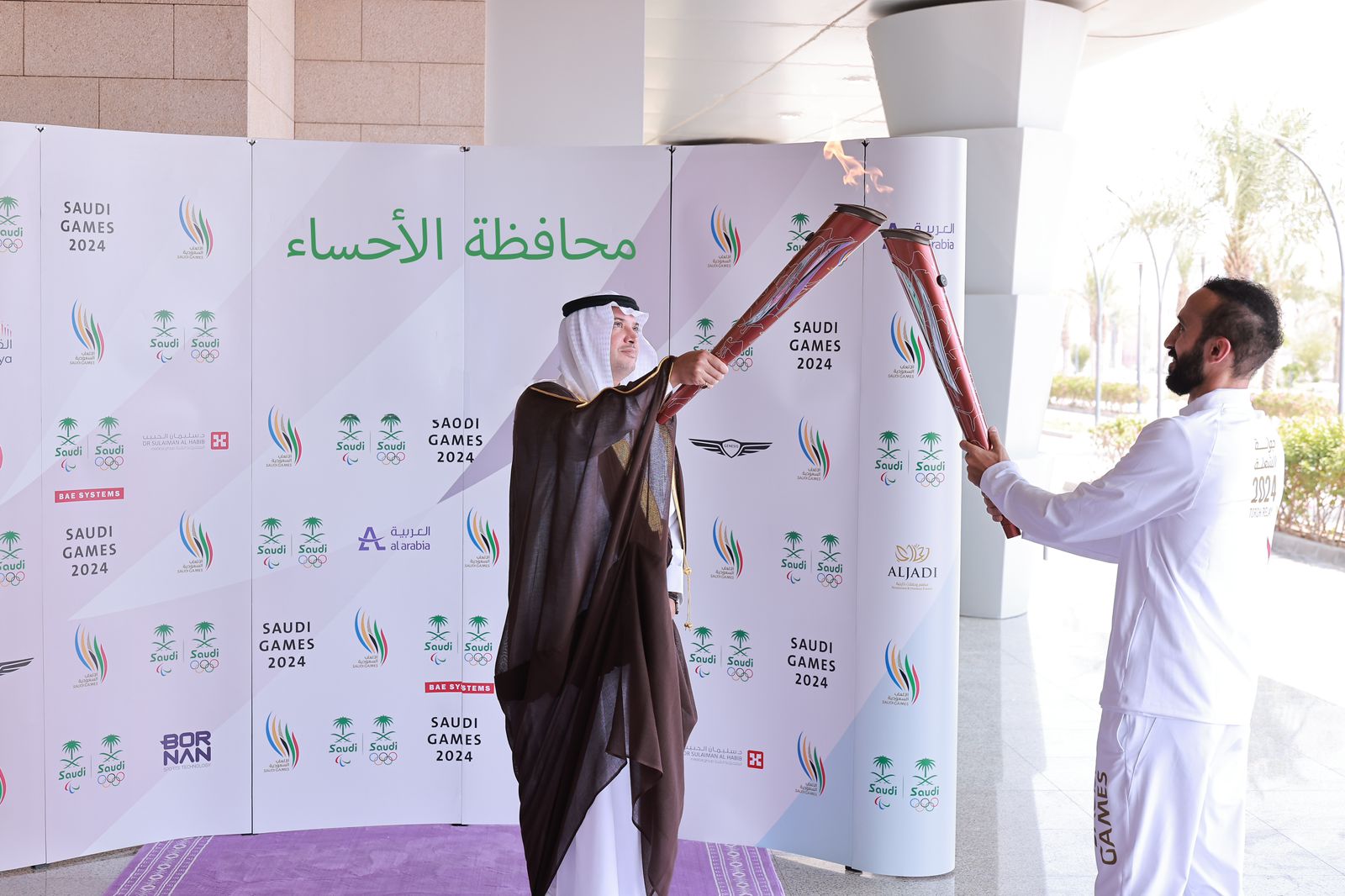 حيث بدأت جولة الشعلة في محافظة الأحساء بزيارة قصر خزام وحمل الشعلة بطلة الفروسية فنون الحميدان الحاصلة على فضية دورة الألعاب السعودية 2022، وذهبية بطولات دولية فئة ٣ نجوم ونجمتين في السعودية 2023، وذهبية في شوطين للسيدات ١ و٢، في نهائي دوري جاهز 2024، ومن ثم حمل الشعلة لاعب المنتخب للبادل فهد السعد مصنف دولي وفاز بالمركز الأول في النسخة الاولى من دورة الألعاب السعودية ولاعب المنتخب الوطني للبادل.