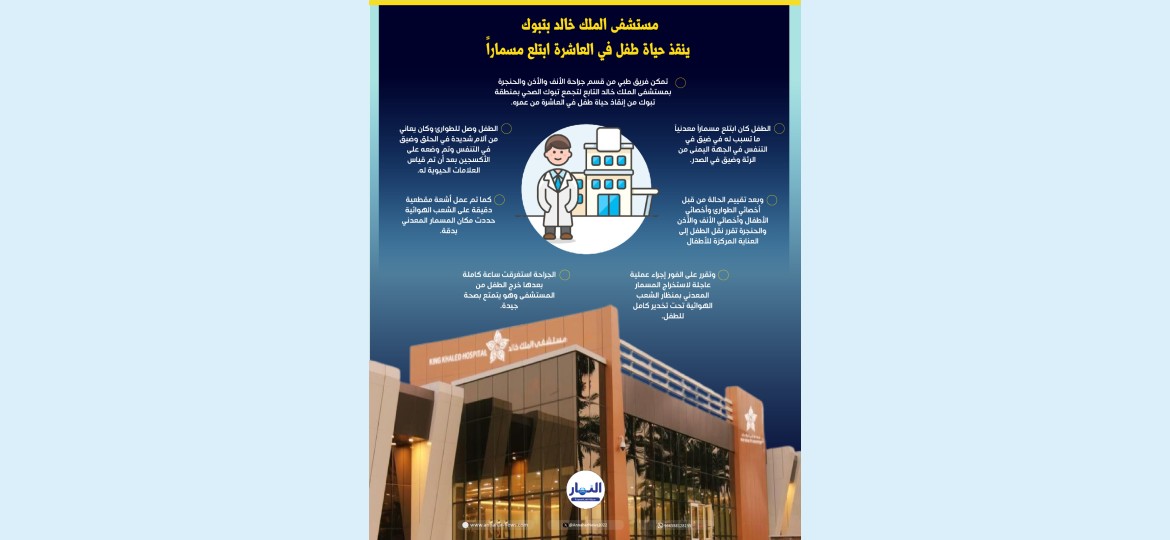 تمكن فريق طبي من قسم جراحة الأنف والأذن والحنجرة في مستشفى الملك خالد التابع لتجمع تبوك الصحي بمنطقة تبوك من انقاذ حياة طفل في العاشرة من عمره ابتلع مسماراً معدنياً مما تسبب له في ضيق في التنفس في الجهة اليمنى من الرئة وتضييق في الصدر.