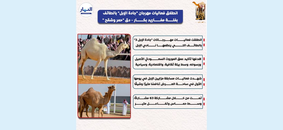 انطلقت اليوم فعاليات مهرجانات "جادة الإبل" بالطائف في نسختها الثالثة، التي ينظمها نادي الإبل بهدف تأكيد عمق الموروث السعوديّ الأصيل ورسوخه، وسط بيئة ثقافية، واقتصادية، وسياحية، وترفيهية عن الإبل وموروثها العريق.
