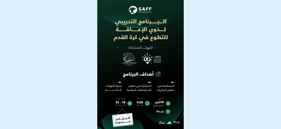 تقيم المسؤولية الاجتماعية في الاتحاد السعودي لكرة القدم، يوم الاثنين المقبل، البرنامج التطوعي لذوي الإعاقة في مجال كرة القدم، بمشاركة هيئة رعاية الأشخاص ذوي الإعاقة، ونادي ذوي الإعاقة بمحافظة جدة.