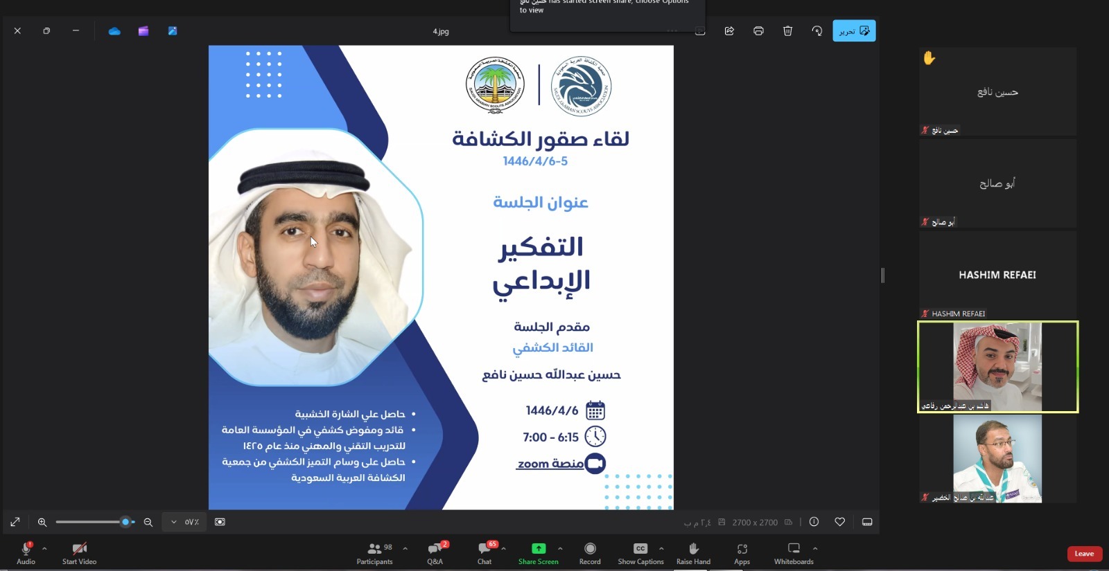 اختتمت جمعية الكشافة العربية السعودية أمس لقاء صقور الكشافة ووسام كشافي العالم الذي عقدته (عبر الاتصال المرئي) , خلال الفترة 5-6/4/1446هـ، بمشاركة 150 كشافاً وجوالاً من مختلف قطاعات الجمعية، في إطار حرصها لمساعدة الكشافة والجوالة للحصول على شارة الصقر الكشفي ووسام كشافي العالم، وتفعيل أهداف التنمية المستدامة، حيث تلقى المتدربون جلسات تدريبية وتدريبات عملية يُنتظر أن تُسهم في نشر مفاهيم السلام لديهم، وتنمي الجوانب التوعوية والتثقيفية في كيفية التعاطي مع قضايا البيئة والتعامل معها ، واكتساب مهارات ومعارف تنمي وتطور قدراتهم المختلفة.