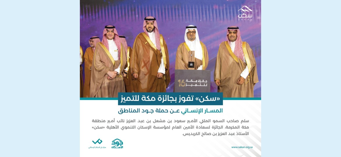 حصدت مؤسسة الإسكان التنموي الأهلية "سكن"، جائزة مكة للتميز في فرع المسار الإنساني في دورتها الـ 16، وذلك نظير تميزها في حملة "جود المناطق"، التي أسهمت في توفير أكثر من 4900 وحدة سكنية للأسر الأشد حاجة في مختلف مناطق المملكة، حيث سلم الجائزة صاحب السمو الملكي الأمير سعود بن مشعل بن عبد العزيز، نائب أمير منطقة مكة المكرمة، لسعادة الأمين العام لـ "سكن" الأستاذ عبد العزيز بن صالح الكريديس خلال الحفل الذي أقيم مساء الباحة 20 ربيع ثانِ 1446 هـ الموافق 23 أكتوبر 2024 م في مدينة جدة بحضور عددٍ من أصحاب السمو الملكي والمعالي والفضيلة والسعادة والجهات الحكومية والخاصة وغير الربحية.