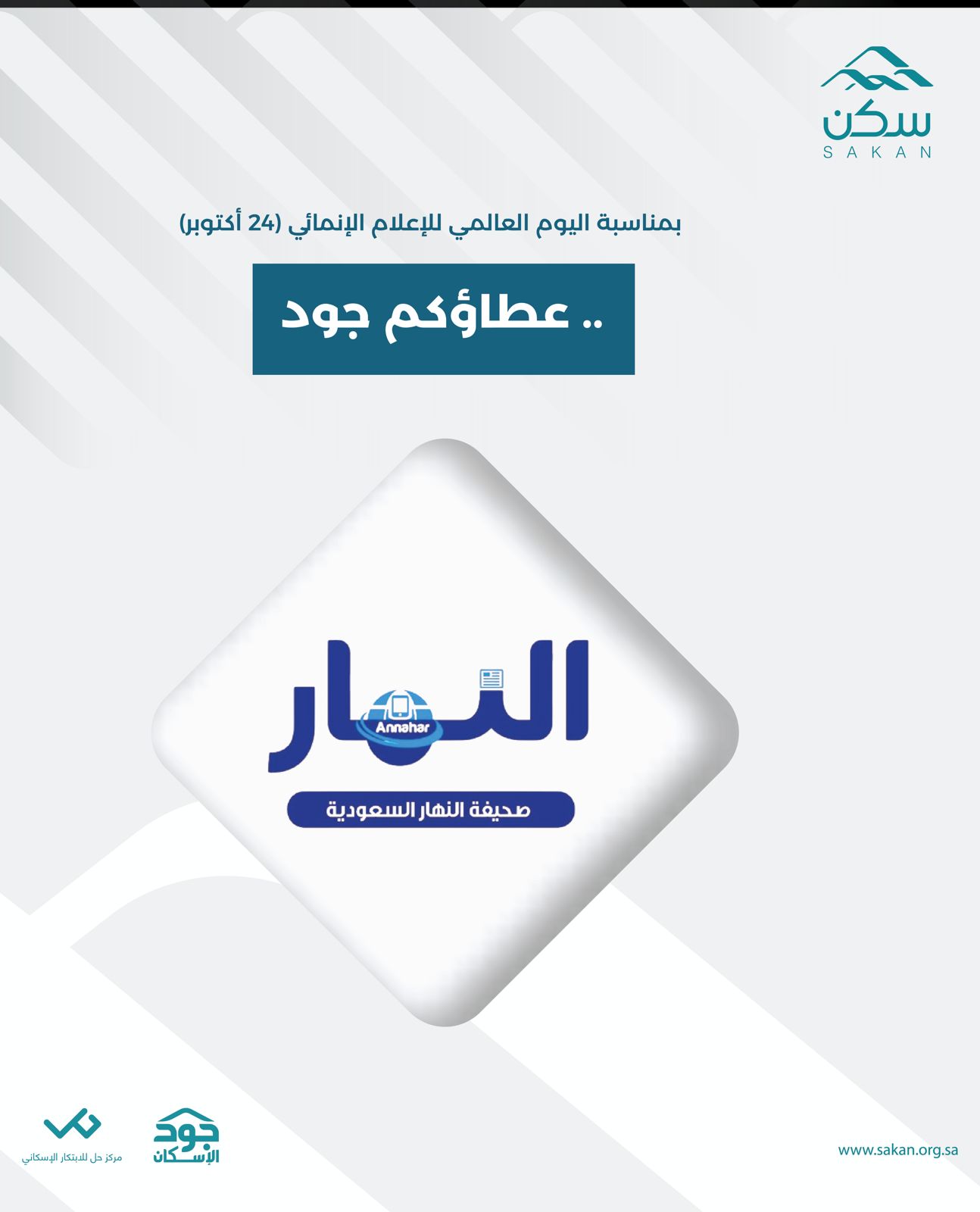 تقدمت مؤسسة سكن، بمناسبة اليوم العالمي للإعلام الإنمائي، بجزيل الشكر والعرفان لصحيفة النهار السعودية وعدد من الشركاء الآخرين من الكيانات الإعلامية الذين ساهموا في نشر رسائل العطاء والتحفيز.