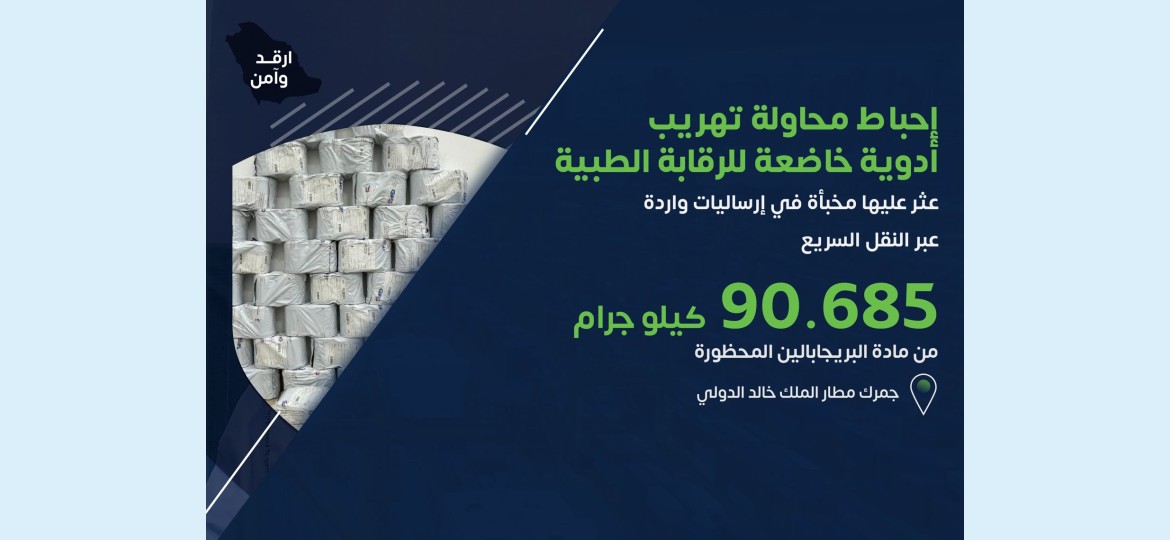 تمكنت هيئة الزكاة والضريبة والجمارك في مطار الملك خالد الدولي من إحباط محاولة تهريب أكثر من 90 كيلوجرام من الأدوية الخاضعة للرقابة، مادة "البريجابالين".