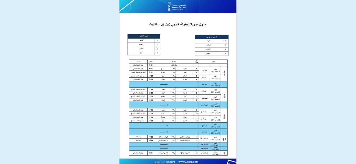 وحددت اللجنة الساعة السابعة مساء يوم 21 ديسمبر موعداً لحفل افتتاح البطولة على ستاد جابر الدولي الذي يحتضن كذلك المباراة الأولى بين الأزرق وشقيقه العماني في الساعة 08:00 مساء اليوم ذاته ضمن المجموعة الأولى، في حين تقام المباراة الثانية في المجموعة نفسها بين المنتخبين القطري والإماراتي في الساعة 10:00 مساءً على ستاد جابر المبارك. كما حددت اللجنة موعد المباراة النهائية في الساعة 07:00 مساءً يوم 3 يناير المقبل على ستاد جابر الدولي.