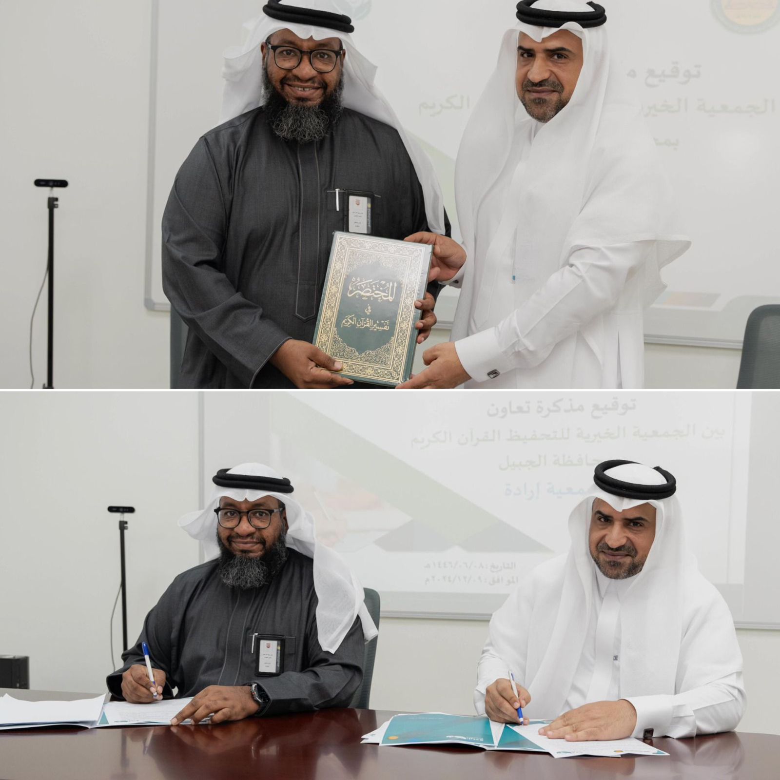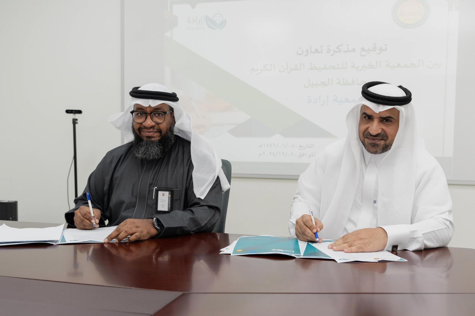 وقع مدير الشؤون الإدارية والموارد البشرية بجمعية إرادة أ. أحمد الزهراني والمدير التنفيذي للجمعية الخيرية لتحفيظ القرآن الكريم بالجبيل أ. هاني عمير مذكرة تعاون بين الجمعيتين؛ لتبادل الخبرات وتعزيز مفهوم الشراكة المجتمعية بين الطرفين.