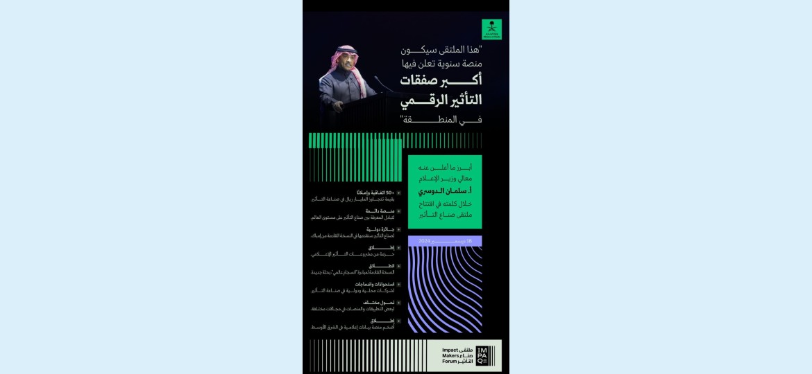 أعلن معالي وزير الإعلام الأستاذ سلمان الدوسري اليوم انطلاق فعاليات ملتقى صناع التأثير الذي يعد منصة رائدة سنوية تعنى بالإعلان عن أكبر صفقات التأثير الرقمي في المنطقة.