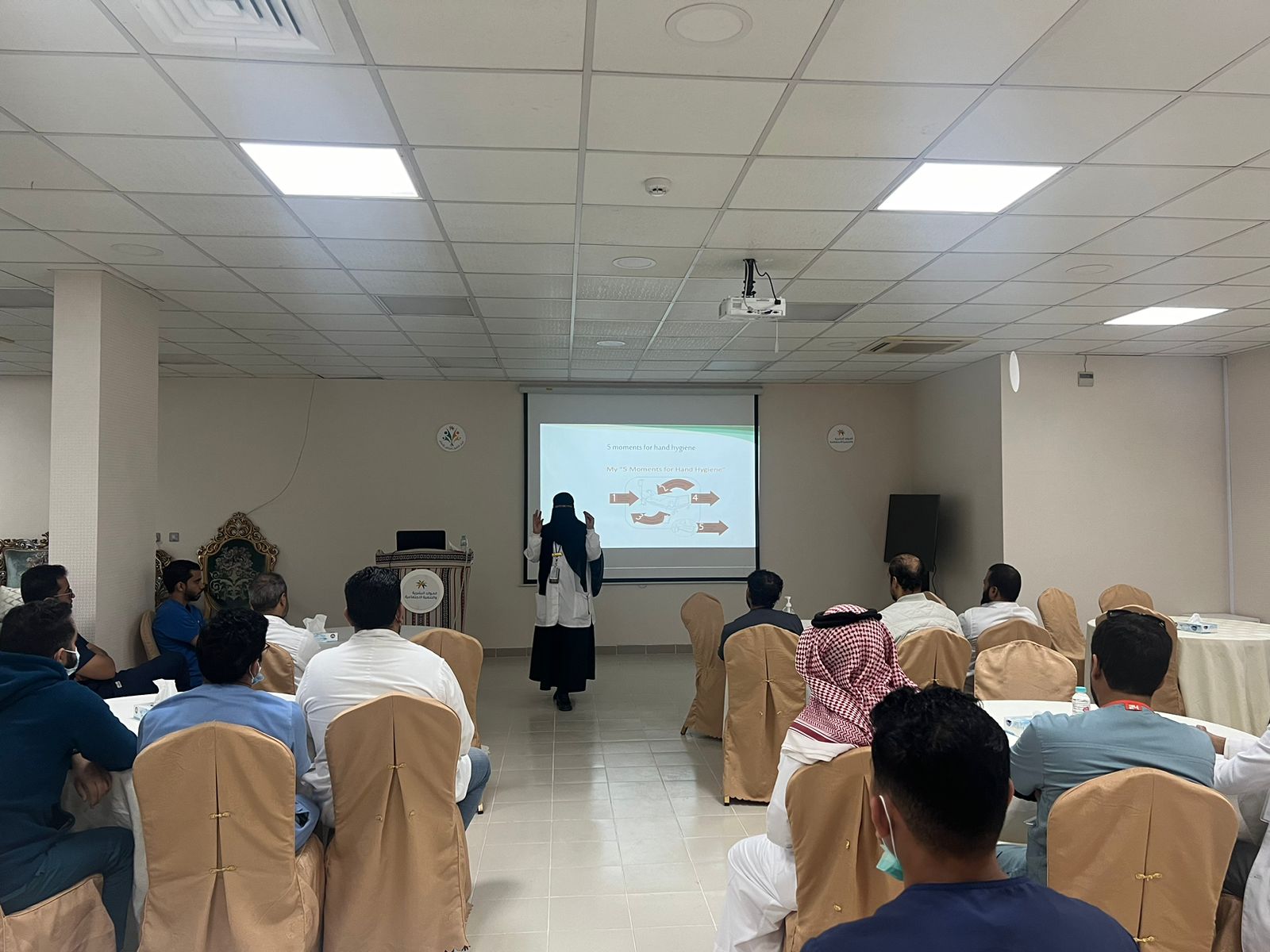 و في الختام تم التأكيد على أن الالتزام بتعليمات و طرق مكافحة العدوى لها دور كبير بالحفاظ على الصحة العامة و الوقاية من حدوث عدوى وقد تم تقديم الشكر لمقدمي البرنامج وإعطاء شهادة الشكر للمحاضرين من قبل مدير مركز التأهيل الشامل للذكور بالدمام الاستاذ محمد بن علي آل بحير والترحيب بمثل هذه الفعاليات لما لها من دور بتطوير العمل بالمركز.