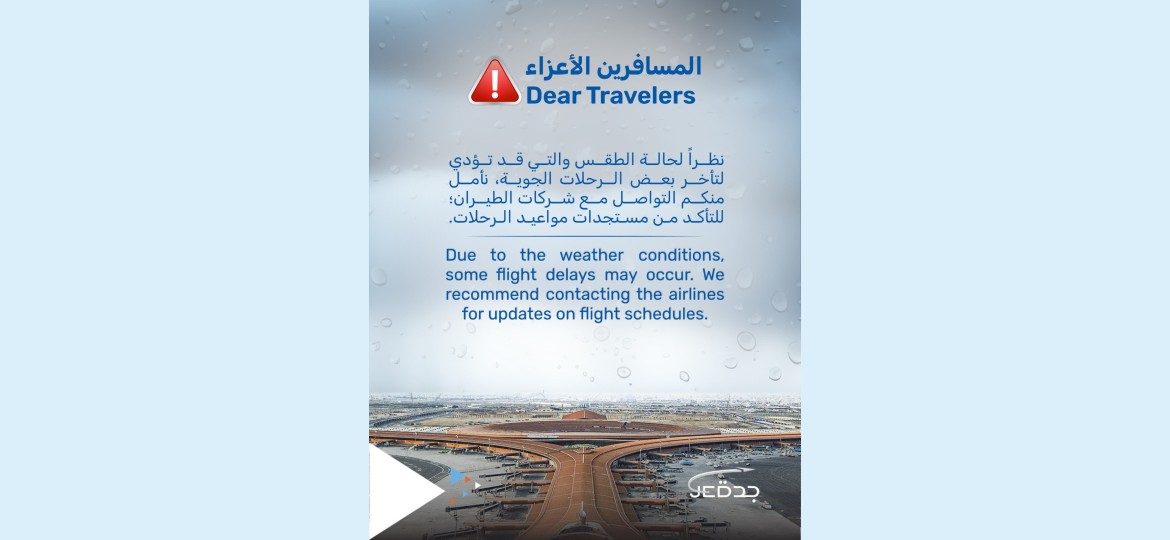 نوهت السلطات المسؤولة في مطار الملك عبد العزيز الدولي، باحتمالية تأخر بعض الرحلات الجوية، في ظل تقلبات الطقس الحالية التي تشهدها المنطقة. جاء هذا التنبيه في بيان رسمي نُشر عبر الصفحة الرسمية للمطار على حساب التواصل الاجتماعي "إكس"، لتحذير المسافرين من أي اضطرابات قد تؤثر على خطط السفر الخاصة بهم.