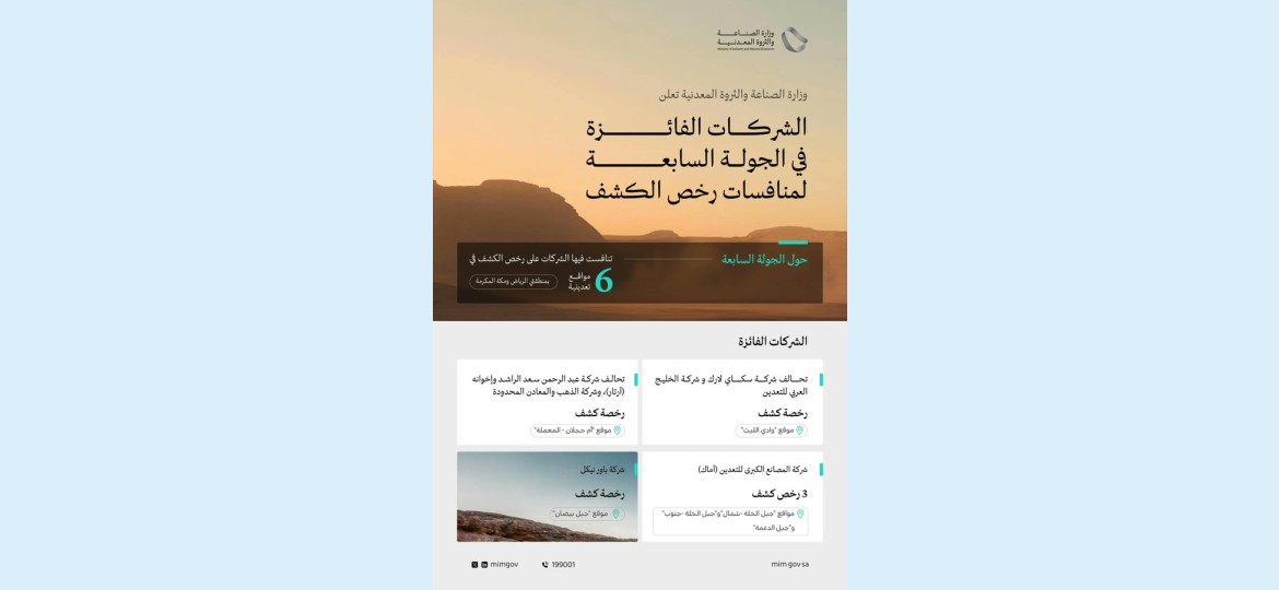 وأوضحت الوزارة، أن الجولة السابعة انتهت بفوز شركة المصانع الكبرى للتعدين (أماك) بـ3 رخص للكشف في مواقع "جبل الخلة - شمال" و"جبل الخلة - جنوب" و"جبل الدعمة"، وفوز تحالف شركة عبد الرحمن سعد الراشد وإخوانه (أرتار)، وشركة الذهب والمعادن المحدودة برخصة كشف موقع "أم حجلان - المعملة"، وفوز تحالف شركة سكاي لارك، وشركة الخليج العربي للتعدين برخصة كشف موقع "وادي الليث"، وشركة باور نيكل برخصة كشف موقع "جبل بيضان".