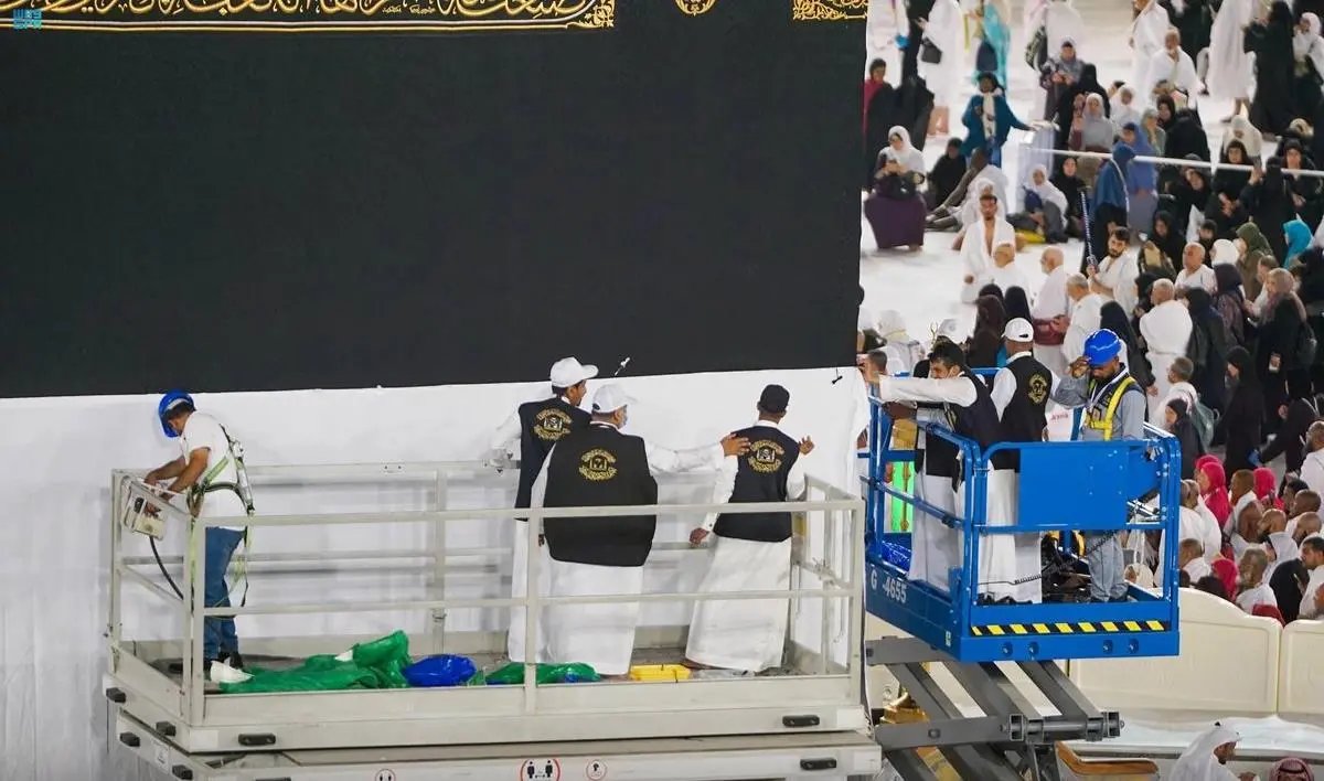 رفعت الرئاسة العامة لشؤون المسجد الحرام والمسجد النبوي - ممثلة بوكالة مجمع الملك عبدالعزيز لكسوة الكعبة المشرفة- اليوم،الجزء السفلي من كسوة الكعبة المشرفة بمشاركة معالي الرئيس العام لشؤون المسجد الحرام والمسجد النبوي الشيخ الدكتور عبدالرحمن السديس، جريًا على العادة السنوية بارتفاع ثلاثة أمتار وفق الخطة المعتمدة لموسم الحج، فيما تمت تغطية الجزء المرفوع بإزار من القماش القطني الأبيض بعرض مترين تقريبًا من الجهات الأربع.