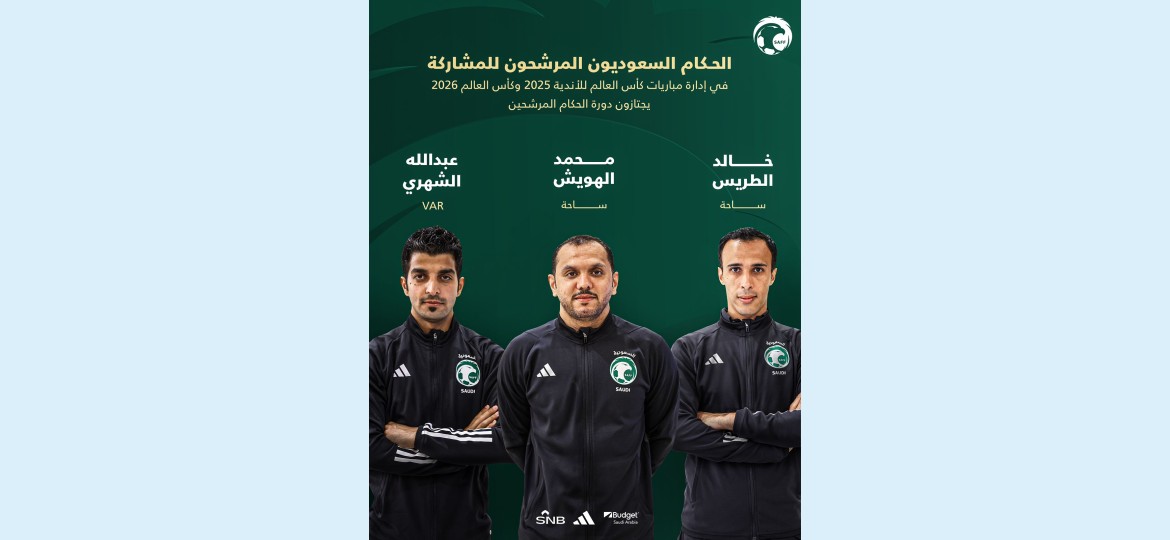 اجتاز الحكمان السعوديان الدوليان محمد الهويش وخالد الطريس دورة الحكام المرشحين للمشاركة في إدارة مباريات كأس العالم للأندية 2025 والمنتخبات 2026، بإشراف الإيطالي بييرلويجي كولينا رئيس لجنة الحكام في الفيفا، والقطري هاني بلان نائب رئيس اللجنة، والسويسري ماسيمو بوساكا مدير دائرة الحكام بالفيفا.